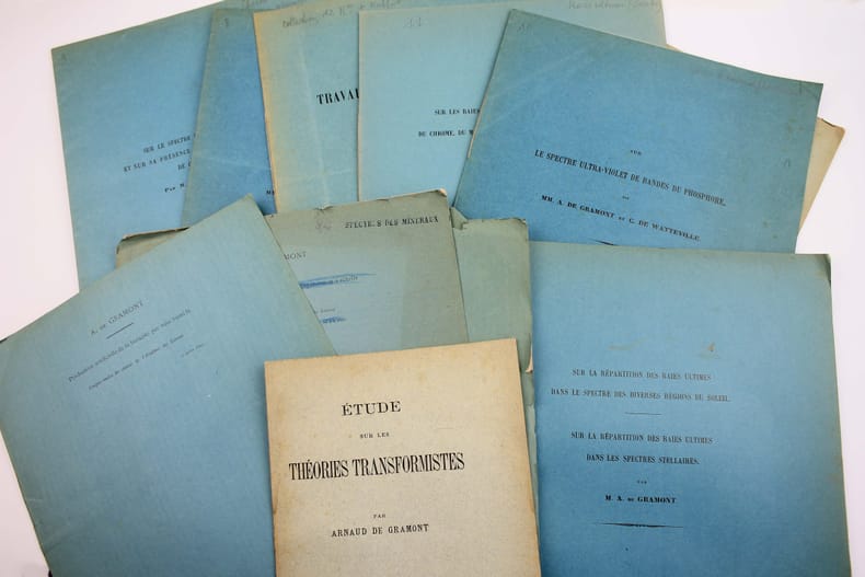 Les travaux scientifiques d'Arnaud de Gramont (1861-1923) concernent la chimie et la minéralogie. "A partir de 1894, il a pris le spectroscope pour instrument de ses investigations. ... Il a ainsi créé une branche nouvelle de la spectroscopie : l'analyse spectrale directe des minéraux. (Edouard Branly) - Production artificielle de la boracite par voie humide. 1890. 2 pp. - Production artificielle de la datholite. 1891. 3 pp. - Observations sur quelques spectres : aluminium, tellure, sélénium. 1898. 3 pp. - Action de l'aldéhydre sur le propylglycol. 1883. 2 pp. - Sur les spectres d'étincelle de quelques minéraux (sulfures métalliques).1894. 3 pp. - Sur les spectres de sélénium et de quelques séléniures naturels. 1895. 3 pp. - Action de la self-induction sur les spectres de dissociation des composés. 1902. 3 pp. - Sur le spectre ultra-violet du silicium (avec C. de Watteville). 1908. 3 pp. - Sur le spectre ultra-violet de bandes du phosphore. 1909. 4 pp. - Sur la répartition des raies ultimes dans le spectre des diverses régions du Soleil. 4 pp. 1910.- Sur la répartition des raies ultimes dans les spectres stellaires. 1910. 3 pp. - Sur les raies ultimes et de grande sensibilité du chrome, du manganèse, du fer, du nickel et du cobalt.1912. 4 pp. - Sur le spectre de bandes de l'aluminium et sur sa présence dans les spectres de la flamme de certains minéraux. 1913. 6 pp. - Sur les spectres stellaires et leur classification. 1922. in-8 de 38 pp. Tiré à part de l'Annuaire du bureau des longitudes. - Etudes sur les théories transformistes. P., impr. des apprentis-orphelins, 1880. In-8 de 23 pp. - BRANLY. Rapport sur le travaux de M. A. de Gramont. P. Gauthier-Villars, 1913. 3 pp. /// In-4 de Broché, couvertures, imprimées pour la plupart. //// DSB 5, 497 : "Gramont specialized in spectroscopy, a field to which he soon contributed new methods."