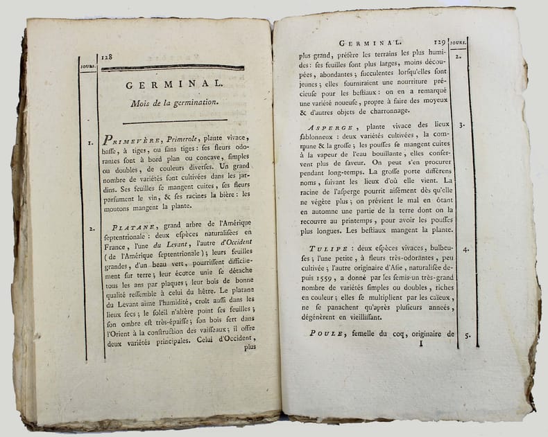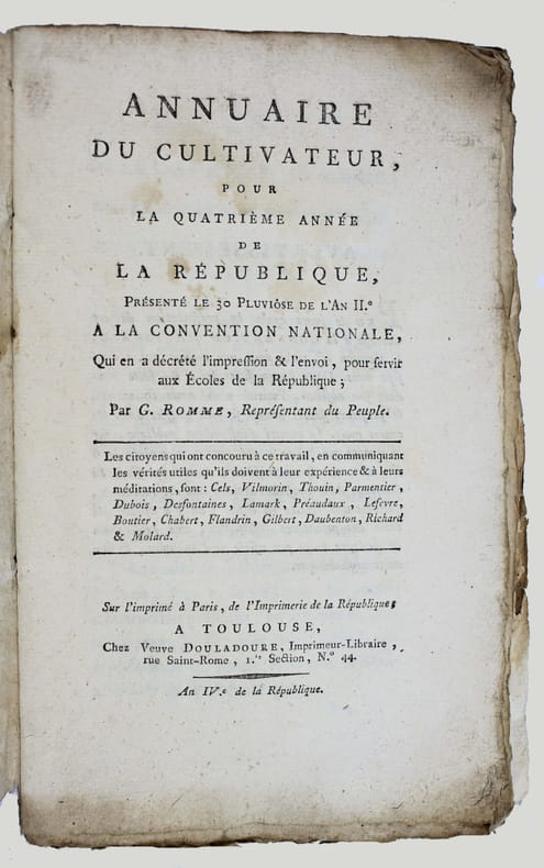 De "Vendémiaire, mois des vendanges" à "Fructidor, mois des fruits" c'est une suite de notices sur les plantes, les légumes, les fruits, les arbres, les animaux, les instruments aratoires... Les citoyens qui ont concouru à ce travail ... sont : Cels, Vilmorin, Thouin, Parmentier, Desfontaines, Lamarck, Daubenton, etc. Exemplaire tel que paru, non rogné /// In-8 de 272 pp. Broché, couverture muette. ////