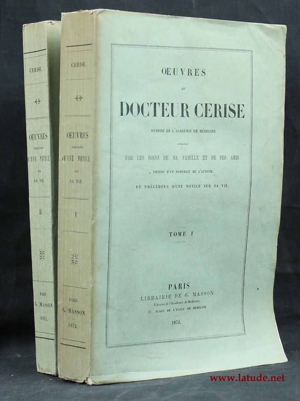 Première édition. Le psychiatre Laurent Cerise ou Cereisi (Aoste, 1807 - 1869) a été l'un des fondateurs des "Annales Médico-Psychologiques". Contient, t. 1 : Notice biographique - Des fonctions et des maladies nerveuses. - t. 2 : Mélanges médico-psychologiques. Ce dernier volume contient une étude sur la religion des Hindous. Ouvrage rare, très certainement tiré à petit nombre. Très bon exemplaire, en partie non ouvert. /// 2 volumes in-8 de portrait, (4), XXXI, 508 / (4), 446 pp. Broché, couverture imprimée. ////