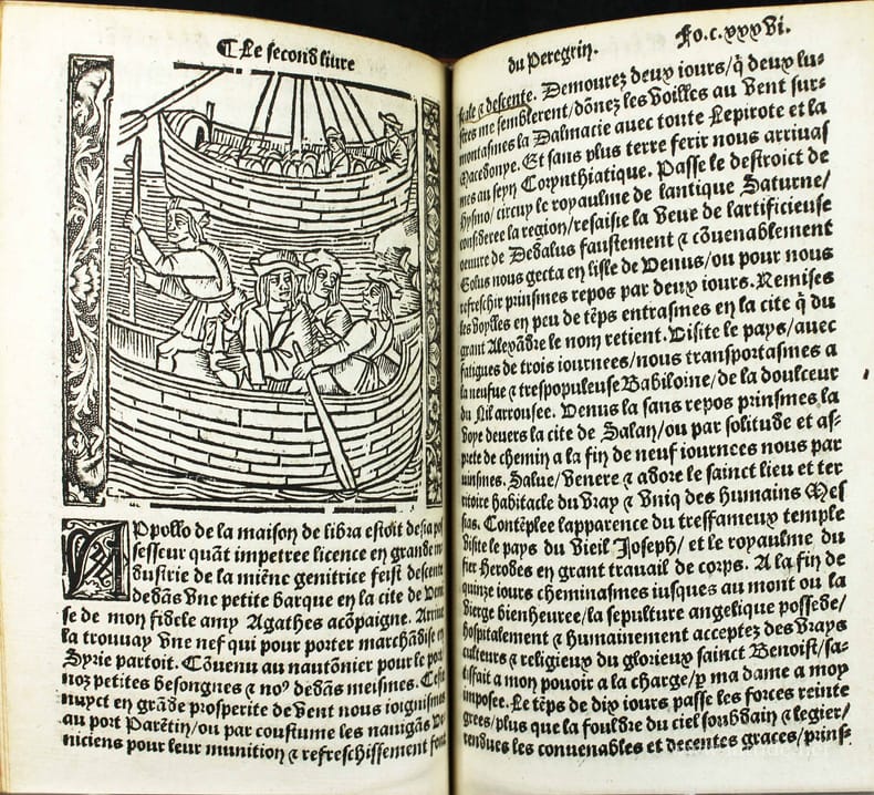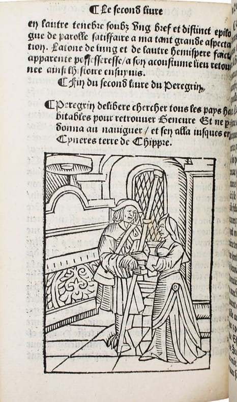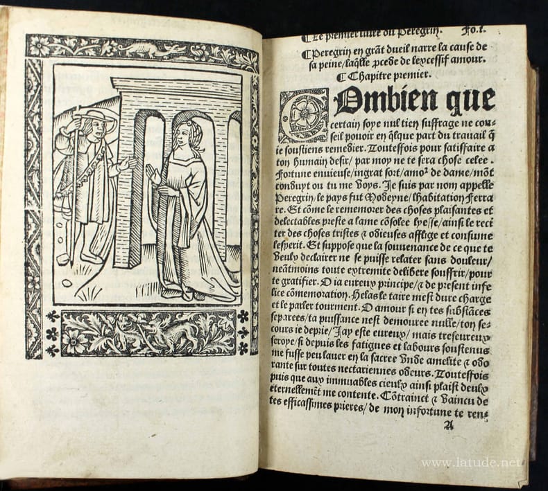 Edition "revue au long et corrigée outre la première impression par Jehan Martin". Elle est illustrée par trois gravures sur bois, une en tête de chaque partie. Ce roman d'aventures et d'amour, dans le style de Boccace, a été l'un des ouvrages les plus lus au début du XVIe siècle. Il a été publié pour la première fois à Parme en 1508 et traduit en français en 1527. Edition partagée entre André, Sergent, Couteau et Sertenas. Titre en rouge et noir, caractères gothiques et initiales gravées. Exemplaire un peu court en tête en début d'ouvrage, des passages soulignés à l'encre anciennement, discrètes restaurations à la reliure. Bechtel, Catalogue des gothiques français C-124. Inventaire chronologique des éditions parisiennes 1229./// In-8 de (12), CCCXXVI ff. Veau, dos à nerfs. (Reliure du XVIIIe.) ////