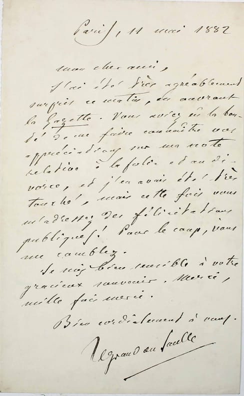 LETTRE AUTOGRAPHE signée, datée du 11 mai 1882. Remercie le destinataire pour un article élogieux. "Mon cher ami, j'ai été très agréablement surpris ce matin, en recevant la Gazette. Vous aviez eu la bonté de me faire connaître vos appréciations sur ma note relative à la folie et au divorce ... cette fois vous m'adressez des félicitations publiques !". Une note au crayon indique que la lettre est adressée au Dr. Une note au crayon précise que la lettre était adressée au Dr Hippolyte Brochin. /// de 1 page ////