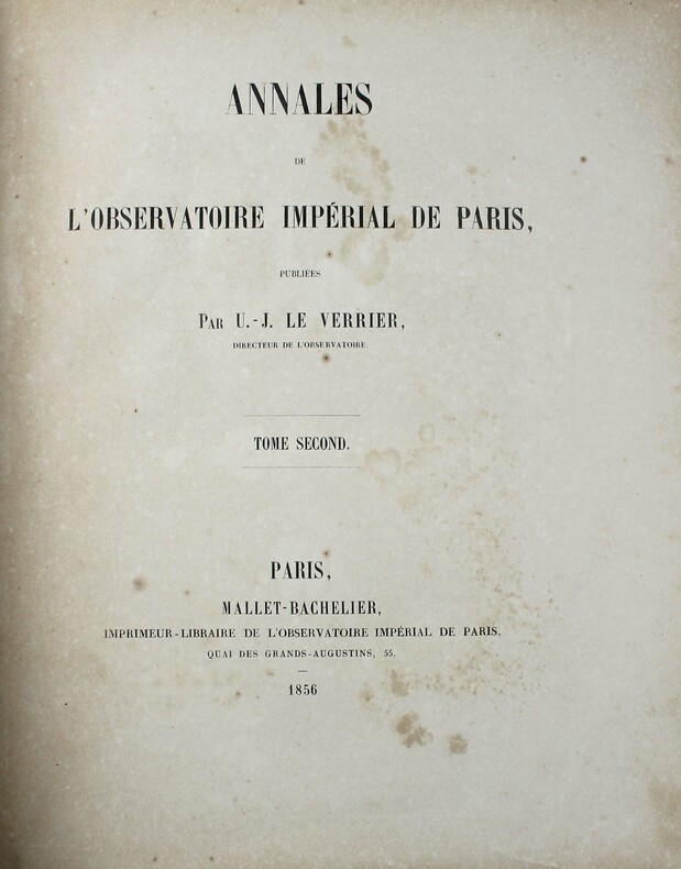 Des rousseurs. La couverture n'est probablement pas celle de ce volume. Elle porte "Annales ... publiées par Baillaud" mais sur le titre, il s'agit de cette même publication publiée "par Le Verrier". Des rousseurs. /// In-4 de VIII, 301 pp., 1 planche dépliante. Broché, couverture imprimée. ////