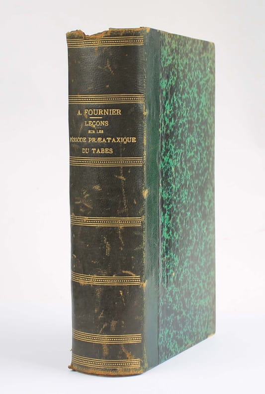 Relié à la suite : - FOURNIER, Alfred. De l'ataxie locomotrice d'origine syphilitique (tabes spécifique). Leçons cliniques professées à l'Hôpital Saint-Louis. Paris, Masson, 1882. In-8. (4), 396 pp. "Fournier advanced the doctrine of the syphilitic origin of tarbes, a hypothesis which was opposed for a time". Garrison-Morton 4782 (édition de 1876). Manque à la coiffe, mouillure sur les premiers feuillets du second ouvrage. /// In-8 de (4), 440, (4) pp. Demi-basane verte, dos orné. (Reliure de l'époque.) ////
