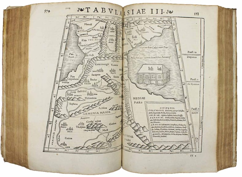 Première édition illustrée et première édition des commentaires et de la traduction latine de l'humaniste Xylander, professeur à l'université d'Heidelberg. Edition recherchée de la "Géographie" de Strabon, pour la correction de son texte et son illustration. Elle comprend 8 cartes dans le texte d'après Mercator et 27 cartes sur double-page, qui sont les mêmes bois gravés par Sébastien Munster, pour son édition de Ptolémé (1540). L'humaniste Guilielmus Xylander (1532 - 1576) a été nommé professeur de grec de l'Université de Heidelberg à l'âge de vingt-cinq ans. Il édita et traduisit de nombreuses uvres de l'Antiquité, dont les "Eléments" d'Euclide, et apporta d'importantes contributions à la diffusion des mathématiques. Texte grec et latin sur deux colonnes. Marque de l'imprimeur sur le titre et le dernier feuillet. Bel exemplaire dans une élégante reliure de l'époque. Adams S-1907. USTC 694731. In-folio de (116), 977, (3) pp. Vélin, dos à nerfs, encadrement à froid avec fleurons au coins et grands fleurons dorés au centre. (Reliure de l'époque.) - - - - - - - - - - - - - - - - - - - - First illustrated edition and first edition of the commentary and the Latin translation by Guilielmus Xylander, professor at the University of Heidelberg. Xylander's edition of Strabo. Illustrated by 8 maps in text after Mercator and 27 double-page woodcut maps by Sebastian Münster, used in his edition of Ptolemy. The humanist Guilielmus Xylander (15321576) was appointed professor of Greek at the University of Heidelberg at the age of twenty-five. He edited and translated numerous works from antiquity, including Euclid's Elements, and made important contributions to the dissemination of mathematics. Greek and Latin text in two columns. Printer's mark on the title page and last leaf. A fine copy in an elegant contemporary binding. -