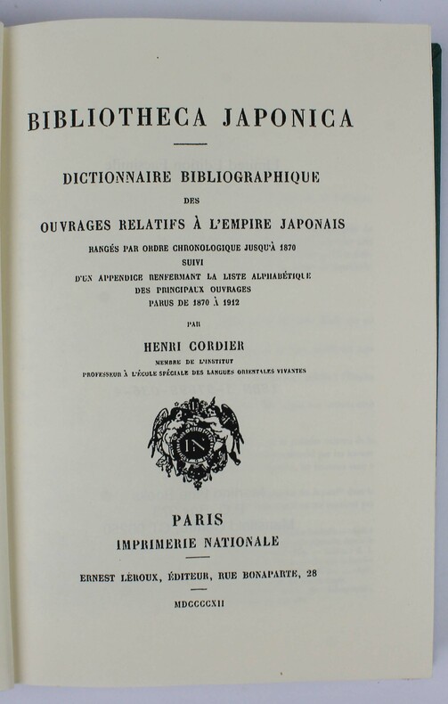 Martino Reprints around 1977. Around 3 500 works on Japan. Good copy. /// In-8 de XII pp., 762 colonnes. Toile verte. ////