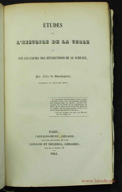 Paris, Carillian-Goeury, Laglois et Leclercq, Paris, Carillian-Goeury, Laglois et Leclercq1844 ; in-8, demi-veau fauve, dos lisse, filets dorés et à froid, pièce de titre noire, tranches jaspées. (Reliure de l’époque) 394 pp., iv pp. (additions), 3 ff. (table et errata), 2 planches dépliantes en noir et 1 grande planche dépl. en couleurs entoilée.ÉDITION ORIGINALE. Félix de Boucheporn (1811-1857) était ingénieur des mines. S’il a donné quelques publications proprement géologiques, ses deux principaux ouvrages relèvent surtout de la spéculation philosophique. Dans sont Etude sur l’histoire de la Terre, Boucheporn avance l’idée que la géologie et les formes vivantes sur la Terre ne peuvent s’expliquer comme l’aboutissement des phénomènes d’évolution observables aujourd’hui. Pionnier du transformisme catastrophiste, il considère que les évolutions graduelles des êtres et des roches telles qu’on les explique, existent bien durant des périodes de stabilité mais que la variété de milieux existants et passés ne peut s’expliquer qu’en considérant que ces ères sont séparées par des cataclysmes majeurs, la chute de comètes. 130 ans plus tard, Gould et Eldredge, en énonçant leur théorie des “equilibres ponctués” ne démentent pas Boucheporn.