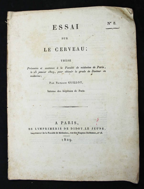 Thèse sur les rapports entre l'encéphale et le système artériel. Natalis Guillot poursuivra par la suite ses recherches en neurologie, puisqu'il a publié en 1844, une "Exposition anatomique de l'organisation du centre nerveux, dans les quatre classes d'animaux vertébrés". /// In-4 de 23 pp. Broché, sans couverture. ////