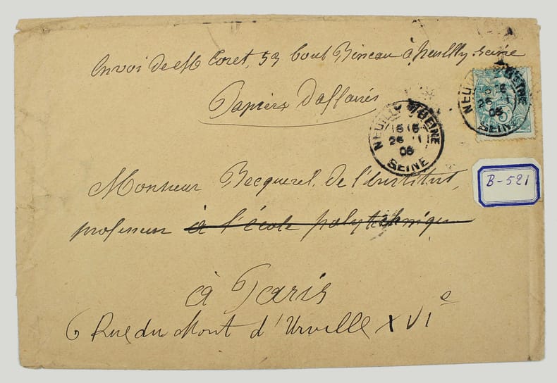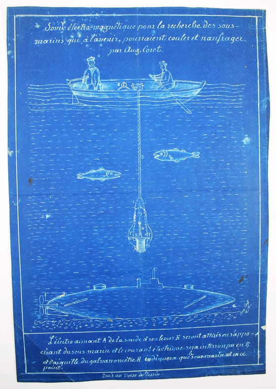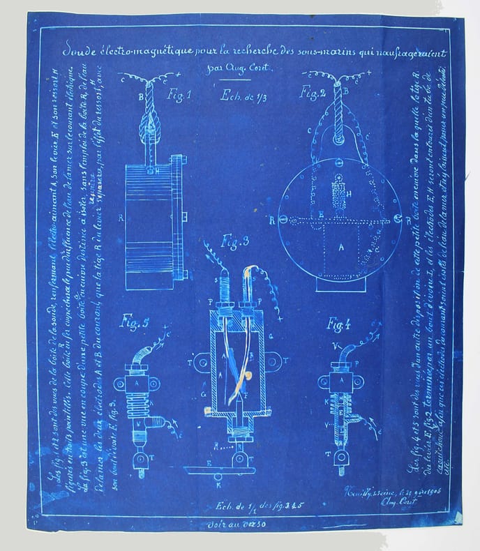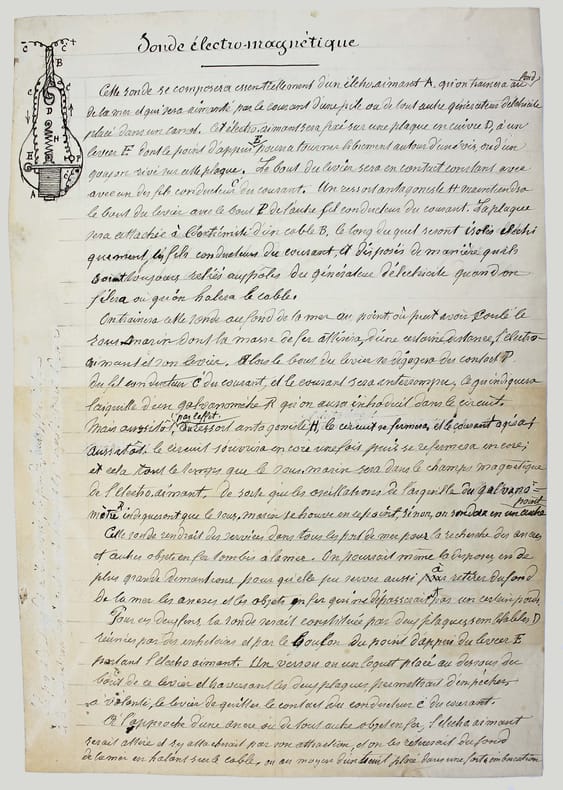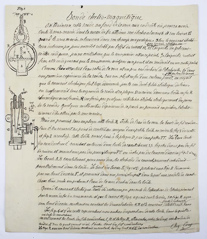 Deux lithographies sur fond bleu, avec au verso une description autographe signée, avec croquis, de l'invention d'Augusin Coret. Joint l'enveloppe d'expédition adressée à Henri Becquerel. /// In-4 de ////