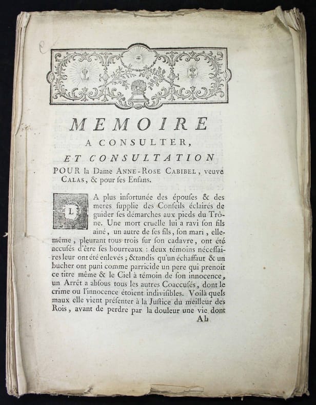 Première édition, elle est de format in-4, de ce célèbre factum par l'avocat de la famille Calas. Tel que paru. /// In-4 de 71 pp. Cousu sur brochure à l'époque. ////