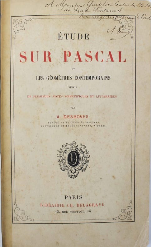 Première édition. Etude de tous les travaux scientifiques de Blaise Pascal. Envoi manuscrit de l'auteur sur la couverture. Reliure en demi-vélin, couverture imprimée conservée. /// In-8 de (4), III, 174, (2) pp., 1 planche. ////