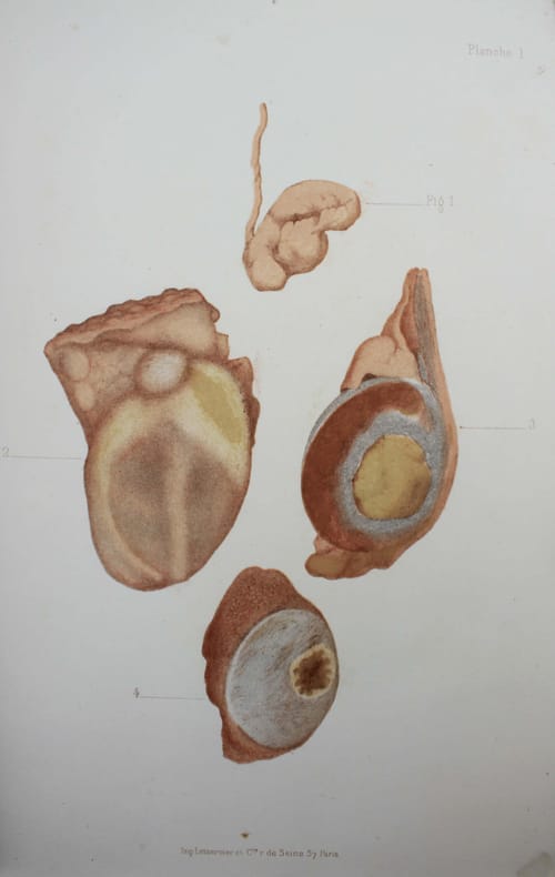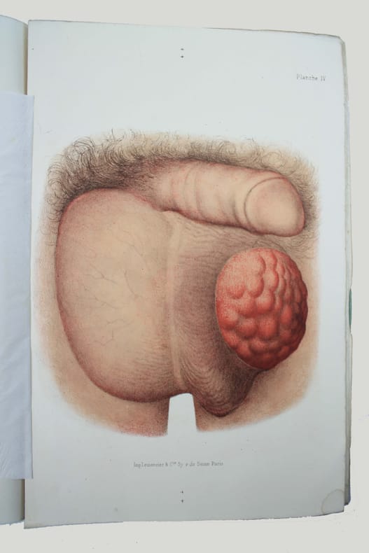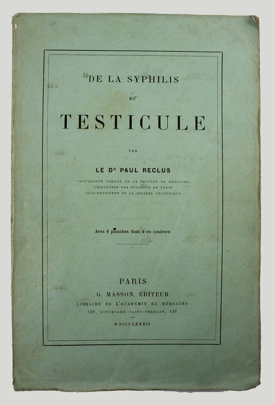 Première édition. Illustré par 6 planches lithographiées dont 4 en couleurs. "Nous étudions dans ce mémoire, le sarcocèle syphilitique. Son histoire est encore obscure et, malgré les travaux de Ricord et les leçons de Fournier, bien des points sont restés dans l'ombre. Nous tentons d'en éclaircir quelques uns." Paul Reclus (Orthez, 1847-1914) est surtout connu pour avoir vulgarisé l'usage de la cocaïne comme anesthésique local. Il a aussi décrit la mastopathie kystique diffuse appelée également maladie de Reclus. Bon exemplaire. /// In-8 de (4), II, 252 pp., (6) ff., 6 planches h.-t. Broché, couverture imprimée. //// First edition. Illustrated by 6 lithographied plates (4 in colors).