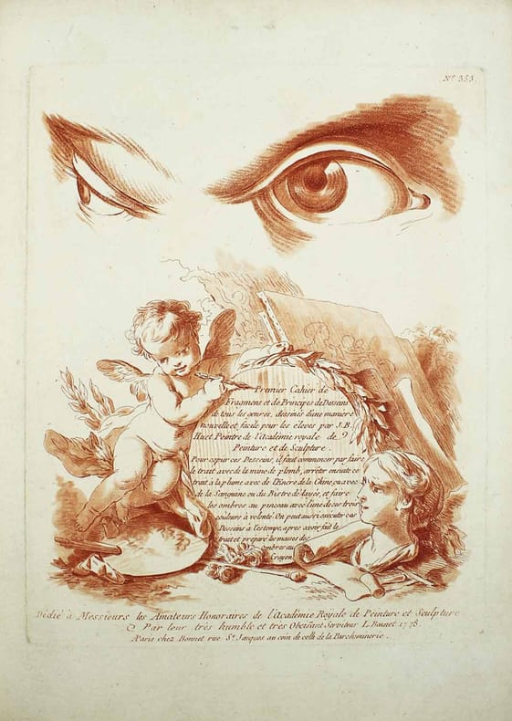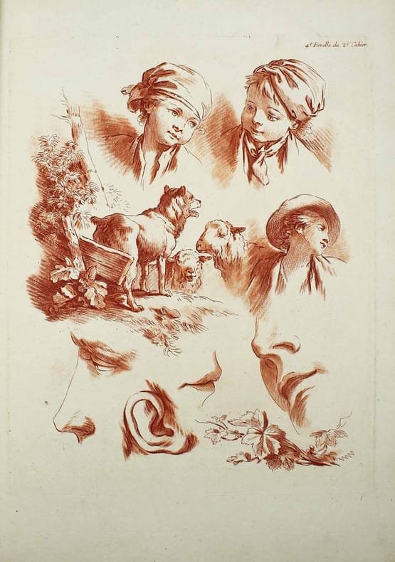 Seule édition. Belle série, complète, de 72 gravures sur cuivre tirées à la sanguine. Il est rare de trouver les 18 cahiers publiés ensembles. Jean-Baptiste Huet (17451811) était peintre et ornementiste. Il a peint des scènes pastorales et légères, dans le goût de François Boucher. Il collabora à la décoration de Versailles et dessina des cartons de tentures pour les manufactures de Beauvais et des Gobelins. Ces planches, gravées et éditées par Louis-Marin Bonnet, sont adressées aux "amateurs honoraires de l'Académie de peinture et sculpture". On trouve au pied de plusieurs gravures des légendes, avec des conseils pour copier ces planches. Provenance : Ex-libris d'Edmond Foulc (1826-1916) grand collectionneur de livres et d'estampes d'architecture et d'ornement. Bel exemplaire. /// In-folio de 72 planches h.-t. Maroquin rouge, dos orné, tranches dorées. (Reliure du XIXe, signée Thierry, Successeur de Petit-Simier.) //// Sole edition. Complete set of 72 etching, printed in red with red wash. It is rare to find the 18 issues together. Jean-Baptiste Huet (17451811) was a painter of pastoral scene, in the François Boucher style and a designer. He collaborated in the decoration of Versailles' castel and drew sketches of tentures for the manufactures of Beauvais and Gobelins. There are captions at the foot of several engravings, with advice on how to copy these plates. Provenance : Ex-libris of Edmond Foulc (1826-1916), a great collector of books and prints of architecture and ornament. Very fine copy. /// PLUS DE PHOTOS SUR WWW.LATUDE.NET