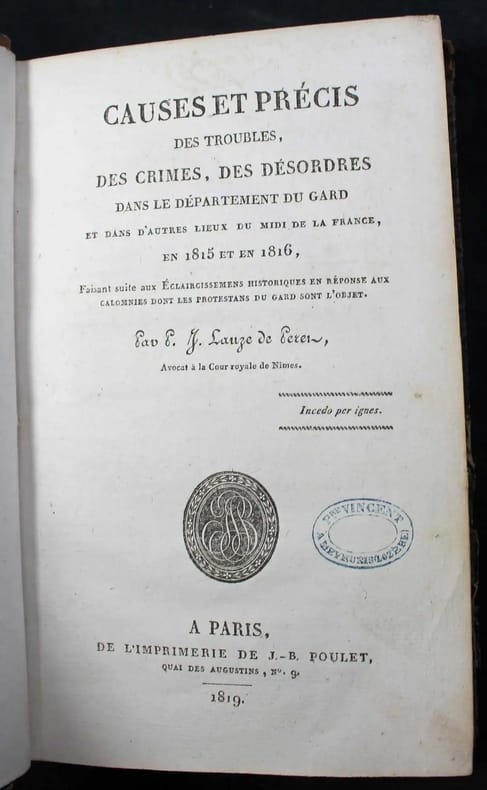 Première édition. Le tome second a pour titre : "Causes et précis des troubles, des crimes, des désordres dans le département du Gard et dans d'autres lieux du midi de la France en 1815 et en 816, faisant suite aux Eclaircissemens historiques en résponse aux calomnies dont les Protestans du Gard sont l'objet." Le premier volume a été publié en trois livraisons, avec un faux-titre et titre pour chacune. Reliures frottées et une fente à la charnière sur la moitié au tome second. /// 2 volumes in-8 de (4), 174, (4), 224, 108 pp. / (6), 460, VIII pp. Demi-basane brune, dos orné. (Reliure de l'époque.) ////
