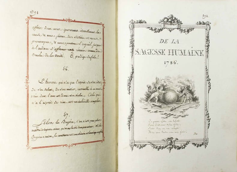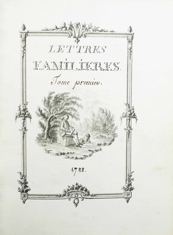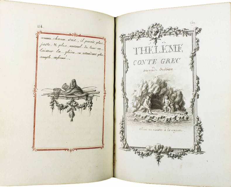 Manuscrit inédit de Jean-Jacques Le Cointe, particulièrement bien calligraphié, contenant des réflexions philosophiques et morales, des pièces littéraires, des «bagatelles», des récits biographiques et des lettres à ses amis. Jean-Jacques Le Cointe (1724-1790) a été au service de la Compagnie des Indes pendant 30 ans, de 1742 à 1772. Entré à l'âge de 18 ans, il a commencé comme employé à la vérification des livres dans les bureaux de Paris. Il fut envoyé en 1743 au «fort royal de Saint-Louis, à Juida, côte d'Afrique» (Ouidah, au Bénin) où il resta trois ans. Il s'établit en 1743 à l'Ile de France (Ile Maurice), où il était employé au bureau de la comptabilité générale. Il a été nommé chef de bureau par la suite, trésorier et, en 1762, inspecteur général des magasions, arseneaux, ports, etc... «Sa majesté voulut bien l'honorer en 1763 de l'office de conseiller de ses conseils supérieurs des Isle de France et de Bourbon.» Malade, il rentre en France en 1771, s'installe à Lorient et bénéficie d'une pension. On trouve ces détails biographiques dans le volume IV (pp. 305-373) de ce manuscrit: «Précis des services du Sr. L. C... à la Compagnie des Indes pendant 30 ans, de 1742 à 1772. Extrait de ses correspondances et mémoires par Basire des Fontaines son gendre, Lieutenant des Vaisseaux de sa Majesté». Jean-Jacques Le Cointe a été maire de Lorient de Février à Juin 1790 et meurt en Juillet de la même année. «J'écris, ou plutôt je barbouille du papier pour amuser ma vieillesse, pour répandre quelques fleurs sur le bord de ma tombe.» Ce manuscrit n'était pas destiné à être publié. «S'il arrive que quelqu'un d'autre que les miens s'amuse à lire ces cahiers, malgré mes précautions pour que cela n'arrive point...» L'auteur en donne cet aperçu: «Vous trouverez ainsi dans ce fatras des productions indigestes, des rêveries métaphysiques, des châteaux en Espagne, des contes à dormir debout, des lambeaux de l'histoire de ma vie, des portraits sans ressemblance, des chansons dignes du poète des Halles, des épigrammes sans pointe, des lettres en vers & en prose qui ne ressemblent pas à celles de Pline ou de Cicéron, des pensées détachées qui napprennent rien de nouveau, des cela ne finirait point.» Le ton est souvent facétieux, l'auteur s'adressant à feu son oncle Grippon, «de glorieuse mémoire» dont «les deux plus sublimes productions sont l'art de parler sans rien dire et celui d'obliger les gens en fouillant dans leurs poches». Les parties les plus intéressantes, nous semblent être les passages autobiographiques. «Né sans le sein de la douleur, instruit à l'école de l'infortune, le besoin développa mon intelligence dans un âge où les autres hommes sentent à peine qu'ils existent & la philosophie m'adopta, pour ainsi dire, dans le berceau.» Ses parents se séparent. Il est confié à sa mère qui néglige son éducation; à l'âge de neuf ans, il ne savait toujours pas lire. Vite orphelin, il est confié à plusieurs maîtres dont un oncle curé janséniste et un maître d'école qui lui enseigne «premièrement à prier Dieu dans une langue que je n'entendais pas, mais quapparemment la Divinité entend mieux qu'aucun autre. Secondement à lire & à écrire dans tous les caractères usités.» Mon père, en mourant, ne m'avait laissé pour tout héritage que la bienveillance de ses amis.» Retou ou Restou, directeur de l'Académie de peinture, l'architecte Servandoni, Dupré, premier danseur de l'opéra, Jean Philippe Rameau... A la suite d'une aventure amoureuse contrariée, qu'il narre longuement, il est prié d'aller en Afrique se faire oublier pendant trois ans. Puis il poursuivra sa carrière dans la Compagnie des Indes à l'île Maurice. Ce manuscrit se fait aussi l'écho des problèmes politiques du moment. L'auteur écrit longuement sur la convocation des Etats généraux, s'étend sur le nécessaire rôle politique que doit avoir le Tiers Etat, sur l'inégalité de l'impôt dans le royaume... Il s'inquiète «des troupes qui inondent la Bretagne». On trouve diverses pièces sur ce sujet comme sa «Lettre des citoyens de Bretagne au roi» de 1788. Le cinquième et dernier volume contient de nombreuses lettres. Celles à Mr. Steinauer, Maréchal de Camp, qu'il a connu à lîle Maurice et une étonnante correspondance avec mademoiselle Louise de Batz. Cette jeune femme était une amie de sa nièce, prématurément décédée. Ils ne sont jamais rencontrés, mais une amitié se développe au fil des lettres. Plus qu'une amitié peut-être. Dans son avant dernière lettre, la jeune mademoiselle de Batz écrit: «N'aurais-je pas pris, sans y penser, la plume de l'amour pour celle de l'amitié? Les femmes sont si distraites!» La même lettre se terminant par: «Adieux mon ami, mon amant intellectuel une femme qui ne sait qu'aimer & qui vous aime plus que toutes choses au monde.» Très intéressant manuscrit, de plus de 2000 pages, dressant le portrait d'un homme des Lumières, dont les souvenirs, nous font évidemment penser aux «Confessions» d'un autre Jean-Jacques. Il est très agréablement calligraphié par un secrétaire. (Dans le dernier volume, Le Cointe se plaint que son secrétaire a ajouté à son texte une recette contre les maux de dents!). Toutes les pages de texte sont encadrées de rouge, avec de charmants dessins sur les diverses pages de titre et de nombreux fleurons ou culs-de-lampe. Après la table des matières des premiers volumes, on lit: «Dessins de Philippe. Frontispice & cartouches De Plus». Très bel exemplaire. /// 5 volumes in-8 de (2), 452 / (2), 534 / (2), 425 / (2), 421 / (2), 458 pp. Demi-veau brun, dos orné, dentelle d'encadrement sur les plats, étiquettes rouges et vertes, tranches rouges. (Reliure de l'époque.) //// /// PLUS DE PHOTOS SUR WWW.LATUDE.NET