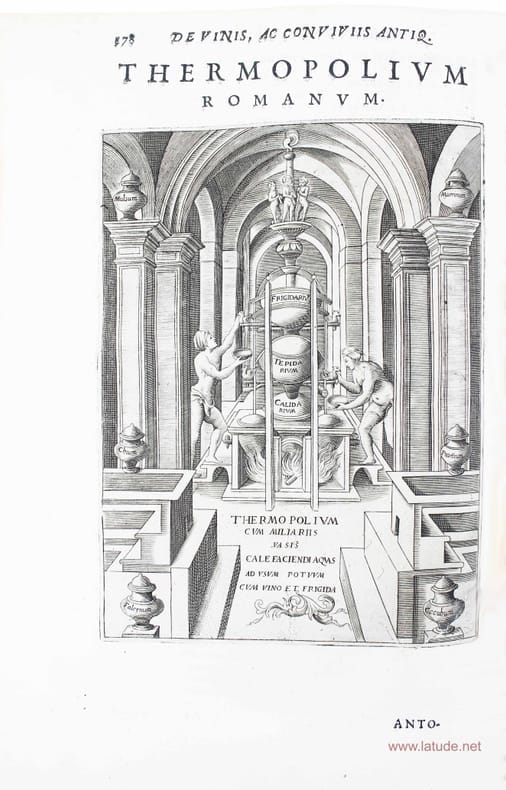 Première édition. "L'ouvrage de Baccius est d'une grande rareté; c'est un des traités les plus considérables qui aient été publiés sur les vins de France, d'Espagne et de tous les pays d'Europe. On y trouve aussi des détails sur les moeurs épulaires des Anciens." (Vicaire 60). Illustré par un beau frontispice gravé sur bois et un autre grand bois gravé à pleine page : on y voit un thermopolium romain, un genre de taverne où l'on servait des repas chauds et des boissons. Sommaire : Vinification et conservation des vins. Consommation des vins liée aux conditions de santé. Caractéristiques particulières des vins. Usage des vins dans l'antiquité classique. Vins des différentes régions d'Italie. Vins importés à Rome. Vins étrangers. Andrea Bacci, (1524-1600) premier médecin du Pape Sixte VI, est l'auteur de nombreux travaux d'érudition et c'est ici son oeuvre la plus importante. Exemplaire probablement de premier tirage : le premier feuillet de texte est paginé "4", alors que dans tous les exemplaires que l'on peut voir en ligne, cette erreur est corrigée en "1". Coiffes restaurées. Bel exemplaire. /// In-folio de (28), 370, (2) pp. Demi-vélin. (Reliure du XVIIe.) //// First edition. Illustrated by a fine woodcut frontispiece and another large woodcut page 178: one sees a Roman thermopolium, a kind of tavern that served hot meals and drinks. "The book of Baccius is extremely rare; it is one of the most significant treaties that were published on wines from France, Spain and all the countries of Europe. There are also details on meals in Antiquity." (Vicaire 60). Summary: Book I -Vinification and storing wine. Book II - Consumption of wine, related to health conditions. Book III - Characteristics of the wines. Book IV - Use of wine in classical Antiquity. Book V - Wines of the different regions of Italy. Book VI - Imported wines in Rome. Book VII - Foreign wines. Andrea Bacci (1524-1600) first physician of Pope Sixtus VI, is the author of numerous scholarly works and this is his most important work. Probably a first issue: the first sheet of text is paginated "4", and in all copies that one can see online, this error is corrected "1".