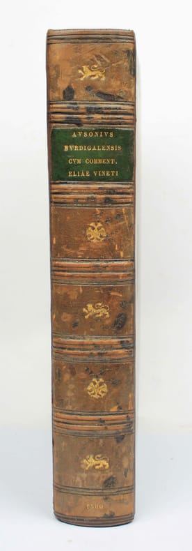 Première édition des commentaires dElie Vinet. Exemplaire du poète Louis Martel, de Rouen, avec des annotations de sa main. On trouve son ex-libris manuscrit en haut de la page de titre, daté de 1585, et, plus bas, sa devise "Illustra Deus Oculum" qui est l'anagramme de Ludovicus Martellus. Louis Martel était proche des poètes de la Pléïade. On trouve quelques uns de ses vers dans les recueil de poésies de son temps. Par exemple, dans les "Oeuvres poétiques de Remy Belleau" (1578), ou dans le "Discours de la vie de Pierre de Ronsard" (1586). Il est aussi l'éditeur de "Poetae tres elegantissimi" (1582). Il enseignait les Belles-Lettres à Rouen et comptait parmi les "plus savants hommes de son siècle" selon le père Farin dans son "Histoire de la ville de Rouen". Martel possédait une fort belle collection de livres et plusieurs manuscrits médiévaux à la BNF portent son ex-libris. Une partie de sa collection est passée ensuite dans celle de Jean Bigot. Au feuillet Aa1verso, on trouve un distique de sa main, "Qua jacet hoc geminos peperit Lucilla, sed aequa / Secti forte, patri vivens, matri manet alter", au sujet d'un épitaphe d'Ausone sur une certaine Lucille, qui mourut, enfantant deux jumeaux, l'un vivant, l'autre mort. Martel a aussi retranscrit des vers, sur la même page et sur le même sujet, de Petrus Loërius et de Pierre Le Loyer. Notons que les oeuvres et mélanges poétiques" de Pierre Le Loyer (1579) contiennent des "Vers à Pierre Le Loyer" de Louis Martel. Enfin, nous avons repéré 16 notes marginales de sa fine écriture en marge du texte d'Ausone ou du copieux commentaire d'Elie Vinet. Certaines sont en grec. [feuillets : d2 - l2 - n3v -n4r- o1 - Aa1v -Bb4v - Hh3v -Ll1v -Ll2 - Mm4 - Oo1v - Oo2 -Ss2 - Yy4 - Zz2v] Autre ex-libris sur la page de titre, qui a été rogné à la reliure : Antoine de Lam? 1620?. La date de 1575 figure au verso du titre et celle de 1580 à la fin. Illustré par 2 planches dépliantes hors-texte (Palais Tutele et Amphithéâtre de Bordeaux) et une dizaine bois dans le texte, 2 sont à pleine page, dont une belle vue de Bordeaux. Titre en noir et rouge avec la marque de Millange. Exemplaire complet des deux feuillets (A2) qui semblent rares: Martialis Campani medici burdigalensis (...) explicatio philosophica in epigrama decimum Ausoni. » Le saintongeois Elie Vinet (1509-1587) a été lun des plus brillants maitres du Collège de Guyenne. Ce collège était au centre de la vie intellectuelle de Bordeaux et de sa région. Montaigne qui l'a qualifié de « meilleur de France », y entra comme élève en 1539, lannée même où Vinet commença à y professer. « Si aucun texte ne nous renseigne sur les rapports de Vinet avec Michel de Montaigne et Etienne de La Boétie, il est probable quil entretint avec eux des relations, sans quon puisse affirmer qu'il les eut pour élèves au Collège de Guyenne. » [L. Desgraves.] Vinet a été léditeur de plus de 43 éditions différentes douvrages qui pour la plupart, on servi à lenseignement quil dispensait. Cest lui qui encouragea lun de ses collègues, Simon Millanges a fonder une imprimerie qui publia plus de six cents ouvrages dont les « Essais ». Brunet 1, 573 : « Belle édition estimée pour le commentaire. Le texte a été imprimé séparément en 1575 et le commentaire en 1580. » Adams A-2282. Desgraves, Elie Vinet 32. Exemplaire aux armes du marquis de la Grange. Des feuillets brunis. Charnières restaurées. Bel exemplaire. /// In-4 de (396) ff. [titre, aa2, A3, aaa4, ee4, ii4, oo4, uu2, A2, a-z, A-K4, A2, A-Z, Aa-Zz, AAa-Ppp4] Veau brun, armes dorées sur les plats, dos à nerfs orné. (Reliure du XIXe.) //// First edition of Elie Vinet's comments. Copy of the poet Louis Martel, of Rouen, with his hand annotations. There is his handwritten ex libris at the top of the title page, dated 1585, and, below, his motto "Illustra Deus Oculum" which is the anagram of Ludovicus Martellus. Louis Martel was close to the poets of the Pleïade. We find some of his verses in some collectione of poems of the period. For example, in the "Oeuvres poetiques de Remy Belleau" (1578), or in the "Discours de la vie de Pierre de Ronsard" (1586). He is also the editor of "Poetae tres elegantissimi" (1582). He taught literature in Rouen and was among the "most learned men of his century" according to Father Farin in his "Histoire de la ville de Rouen". Martel had a very fine collection of books and several medieval manuscripts at the BNF bear his bookplate. A part of his collection was later passed on to Jean Bigot. On the reverse side of page Aa1, we find a distich in his hand, "Qua jacet hoc geminos peperit Lucilla, sed aequa / Secti forte, patri vivens, matri manet alter", about an epitaph of Ausone on a certain Lucille, who died, giving birth to two twins, one alive, the other dead. Martel also transcribed verses, on the same page and on the same subject, of Petrus Loërius and Pierre Le Loyer. Let us note that the works and poetic mixtures" of Pierre Le Loyer (1579) contain "Vers a Pierre Le Loyer" of Louis Martel. Finally, we have spotted 16 marginal notes in his fine handwriting in the margin of Ausone's text or of Elie Vinet's copious commentary. Some are in Greek. [leaves: d2 - l2 - n3v -n4r- o1 - Aa1v -Bb4v - Hh3v -Ll1v -Ll2 - Mm4 - Oo1v - Oo2 -Ss2 - Yy4 - Zz2v] Another bookplate on the title page, which has been trimmed in the binding: Antoine de Lam? 1620? The date 1575 appears on the verso of the title and 1580 at the end. Illustrated with 2 folding plates (Palais Tutele and Amphitheatre de Bordeaux) and a dozen woodcuts in the text, 2 of which are full-page, including a beautiful view of Bordeaux. Title in black and red with the Millange mark. Copy complete with the two leaves (A2) which seem rare: "Martialis Campani medici burdigalensis (...) explicatio philosophica in epigrama decimum Ausoni." The Saintonian Elie Vinet (1509-1587) was one of the most brilliant masters of the College 