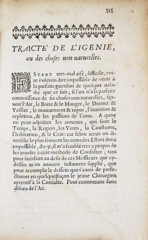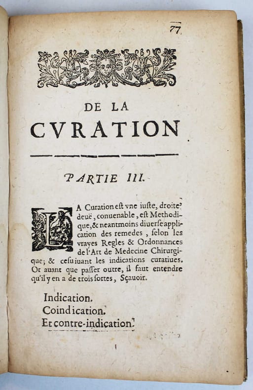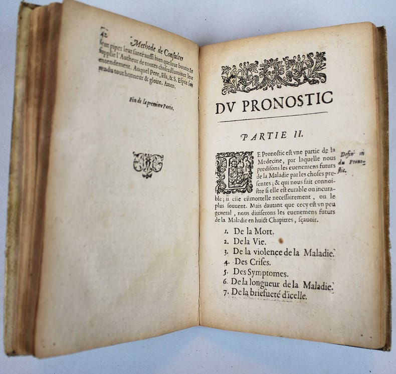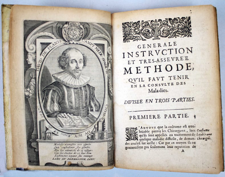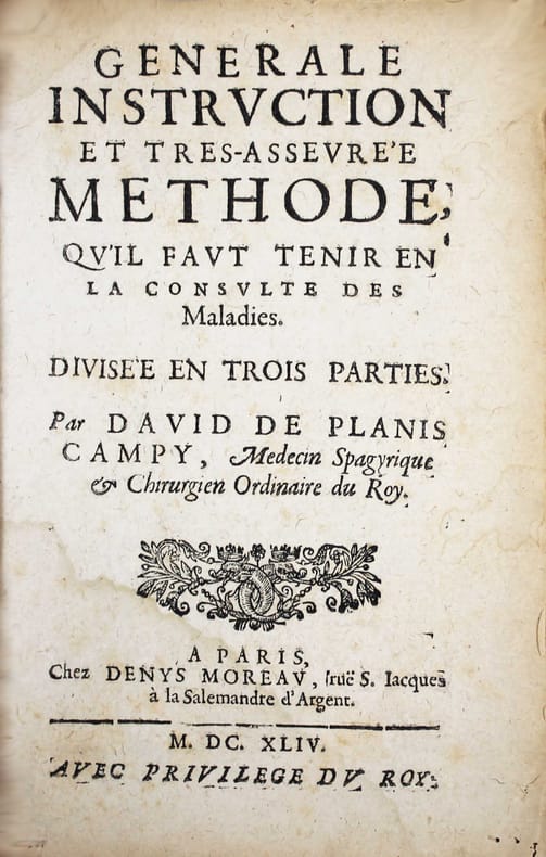 Première édition. C'est sans doute le plus rare des ouvrages de ce médecin spagyrique. C'est une publication posthume, par le fils de l'auteur, que l'on ne trouve pas dans les oeuvres qu'il publiera deux ans plus tard. "Il y a quelques années qu'il avait dressé un petit epitome de la méthode de consulter pour les malades, & je puis vous assurer que bien qu'il l'eut fait pour son usage, toute l'utilité d'iceluy regardait particulièrement ceux qui ont voulu se servir de son conseil, pendant qu'il vivait." (préface de Pierre de Planis Campy). David de Planis Campy, (1589 -1644) était chirurgien du Roi Louis XIII, alchimiste, disciple de Paracelse et initié dans l'art de la transmutation des métaux. Portrait de l'auteur gravé à pleine page. Caillet III, 8722./// In-12 de (24), 132 pp. Vélin. (Reliure de l'époque.) //// First edition, posthumous, published by the author's son. It is not included in the collected works published two years latter. One copy in NLM, but no other copy in North-America in WorldCat.