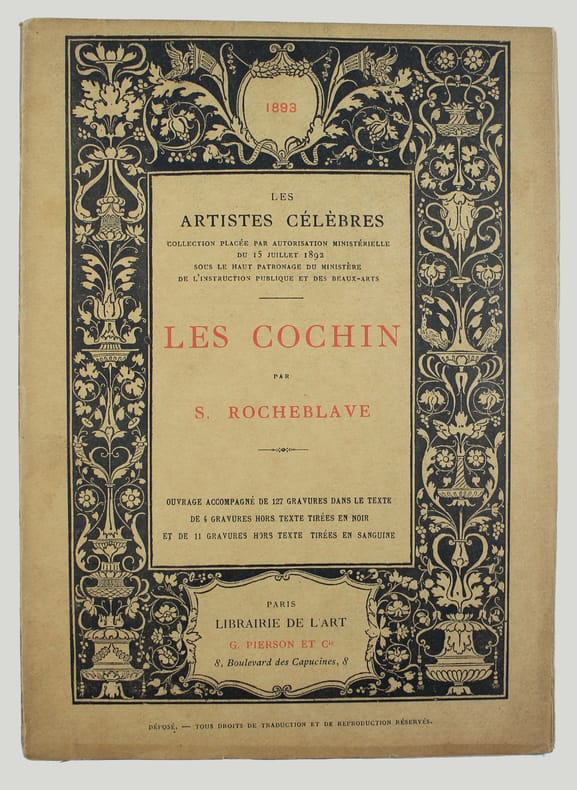 Librairie de l'art, G. Pierson et Cie, "Les Artistes Célèbres", Paris, 1893. In-4, broché sous couverture illustrée, 224 pp. Introduction - Charles Nicolas Cochin dit le Vieux ou l'Ancien - Charles Nicolas Cochin de Paris ou Cochin le père, ou Cochin Ier. - le graveur de Watteau et de Chardin - Charles Nicolas Cochin II ou Cochin le fils ...