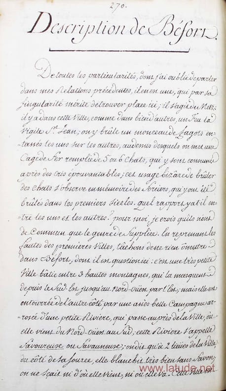 Un "guide de voyage" au XVIIIe siècle, sous la forme de lettres de Joseph de Roissy à son grand-oncle, Joseph Pâris Duverney (1684-1770), financier et créateur de l'Ecole militaire dont il fut le premier intendant. Joseph de Roissy a visité 34 villes du Nord et l'Est de la France (avec des passages en Belgique et en Suisse). C'est une mine incroyable de renseignements sur ces villes au XVIIIe siècle. Pour chaque ville, il donne un court historique et une description de son architecture, il détaille son commerce, ses manufactures, ses habitants, décrit la campagne environnante et ses productions, et donne le prix du blé et d'autres marchandises... Parmi les faits curieux ou remarquables qu'il relate : A La Frère, il décrit longuement un moulin à poudre, et les habitants y sont "ou peu obligeants ou très ignorants". A Saint-Gobain, la manufacture des glaces. A Cambrai, un tableau de Martin Geeraerts, d'Anvers ("Je suis persuadé qu'on ne peut rien voir de plus beau dans ce genre"). A Valencienne, le mécanisme d'une horloge singulière et une machine à vapeur, pour "dessécher les terres, pour en tirer le charbon". A Givet, le représentant du commandant de la ville, lui demande dans quel endroit du pays de Liège est la ville de Paris. A Sedan, les cuisses de grenouilles sont "une branche assez considérable du commerce" ("ceci n'est point une fable"). A Verdun, il a rencontré un guérisseur dénommé Valdaer qui "fait parler les muets, redresse les boiteux, fond la bosse aux bossus". A Metz, il s'étend sur la communauté des juifs et leur synagogue. A Strasbourg, il note que "l'on parle peu français dans la ville". A Besançon, il décrit le fonctionnement d'un moulin à papier. A Troyes, il s'étonne que les maisons soient en bois, le nombre de celles en pierres "se réduit à 5 ou 6". Et nous avons gardé le plus étrange pour la fin : A Metz, "on brûle un monceau de fagots entassés les uns sur les autres, au dessus desquels on met une cage de fer remplie de 5 ou 6 chats qui sont consumés après des cris épouvantables; cet usage bizarre de brûler des chats s'observe en mémoire des sorciers qui y ont été brûlés dans les premiers siècles." (p. 270) Les villes décrites sont Compiègne, La Fère, Saint Gobain, Saint Quentin, Le Catelet, Cambrai, Bouchain, Douai, Valenciennes, Le Quesnoy, Landrecie, Avesnes, Maubeuge, Philippeville, Namur, Dinant, Givet, Charlemont, Charleville, Mézières, Sedan, Verdun, Metz, Nancy, Lunéville, Phalsbourg, Strasbourg, Sélestat, Huningue, Bâle, Belfort, Besançon, Dijon, Troyes. Au début de l'ouvrage, l'auteur note l'approbation que son oncle a eu "la bonté de donner à mes petites relations de l'année précédente." Ces "petites relations" ne font pas parti de ce volume. Quelques mots grattés sur la page de titre, couleur du dos fané, un manque à une coiffe. Bon exemplaire à l'écriture proprement calligraphiée, très lisible. /// In-12 de 325 pp. Maroquin rouge, filets d'encadrement sur les plats, dos orné, tranches dorées. (Reliure de l'époque) ////