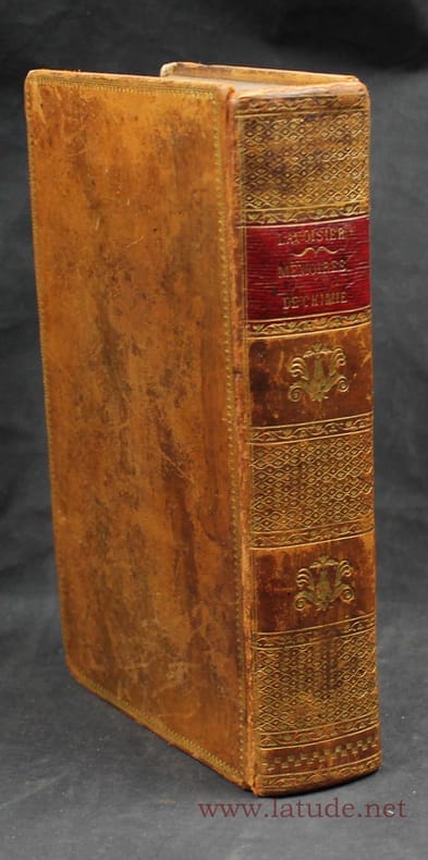 Première édition. Ouvrage rare qui n'a jamais été mis dans le commerce. "En 1792, M. Lavoisier avait conçu le projet de faire un recueil de tous ses Mémoires lus à l'Académie depuis vingt ans. C'était en quelque manière faire l'histoire de la chimie moderne. Pour rendre cette histoire plus intéressante et plus complète, il s'était proposé d'y intercaler les mémoires des personnes qui, ayant adopté son système, avaient fait des expériences à son appui. Ce recueil devait former environ huit volumes. L'Europe sait pourquoi ils n'ont pas pu être achevés. On a retrouvé presque tout le premier, le second en entier, quelques feuilles du quatrième ... Ces fragments n'auraient point paru s'ils ne contenaient un Mémoire de M. Lavoisier qui réclame, d'après les faits qu'il y expose, la nouvelle théorie chimique comme lui appartenant. C'est donc un devoir envers lui que de fixer l'opinion des Savants sur cette vérité." (Préface de Madame Lavoisier). Ces volume contiennent 39 mémoires dont 29 de Lavoisier, 12 paraissant ici pour la première fois. Ils n'ont jamais été réédités. L'édition des "Oeuvres" ne reprend curieusement qu'une partie de ces "Mémoires". A l'exception de quelques exemplaires donné à des Institutions ou à des savants, tous les exemplaires ont été vendus brochés, en 1836, à la mort de Mme Lavoisier. Celui-ci est en reliure d'époque. Les pages de titres n'ont jamais été imprimées, seuls les faux-titres. Dans cet exemplaire, on a relié le faux-titre du tome 2 en tête du tome 1 et il manque le feuillet suivant, une introduction expliquant la raison de la publication de l'ouvrage. Duveen, Klickstein 199 et suiv. Reliure légèrement usée, mais bon exemplaire dans l'ensemble. /// In-8 de (2), 416 pp., (2), 413 pp., 64 pp. Basane marbrée, roulette d'encadrement sur les plats, dos orné. (Reliure de l'époque.) //// First edition. Privately printed by Mme Lavoisier and distributed to eminent scientists.'Lavoisier's preparation of a complete eight-volume edition of his memoirs was halted by his imprisonment and execution during the Reign of Terror; he left behind him only the greater part of Vol.I, all of Vol.II and a small part of Vol.IV. His widow later had these fragments privately printed in two volumes and distributed them to eminent scientists and institutions to ensure that Lavoisier would receive the credit he deserved for his chemical work ... The fifth memoir in Vol.II contains Lavoisier's claim to the discovery of oxidation; it was this claim that prompted Mme. Lavoisier to publish the Mémoires.' Norman 1297.