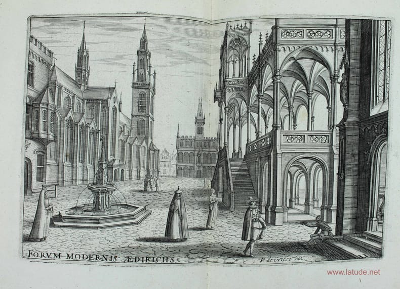 Ce bel ouvrage est illustré par 30 planches sur double page de Hans Vredeman de Vries, et son fils Paul, et gravées par Hendrik Hondius. Elles sont accompagnées d'un titre et de 9 feuillets de texte. Seconde édition, ce livre a été publié une première fois en 1606 sous le titre de "Architectura. La haulte & fameuse science, consistante en cinq manieres d'edifices ou fabriques". Hans Vredeman de Vries (vers 1527 - vers 1607) était peintre et architecte. Sa place essentielle dans la Renaissance flamande tient à l'usage systématique qu'il fit de la perspective linéaire, selon les techniques géométriques italiennes, dont il contribua à propager l'emploi. Deux petites déchirures sans manque dans la marge inférieure de la planche HH. Bel exemplaire. /// In-folio de (20), 30 planches gravées sur double page Vélin. (Reliure de l'époque.) //// This beautiful book is illustrated by 30 plates on double page by Hans Vredeman de Vries, and his son Paul, and engraved by Hendrik Hondius. Wth a title and 9 folios of text. Second edition, it was published for the first time in 1606 under the title of "Architectura". Hans Vredeman de Vries (ca. 1527 - circa 1607) was painter and architect. His key position in the Flemish Renaissance lay in his systematic use of linear perspective, according to Italian geometric techniques, which he helped to spread. Two small tears without missing in the bottom margin of plate HH. Nice copy.
