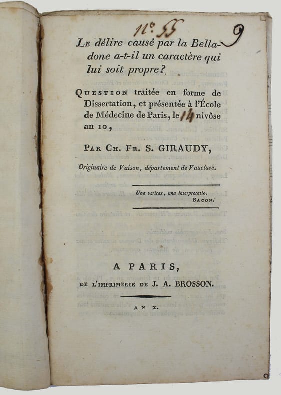 Thèse de Charles François Simon Giraudy (1770-1848), médecin, originaire de Vaison, Vaucluse. /// In-8 de (4), 40 pp. Broché dans une page de partition de musique. ////