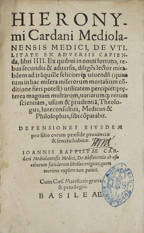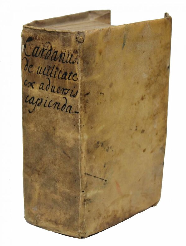 Première édition. "Des avantages que le malheur nous apporte". Après l'exécution de son fils Giovanni Battista pour le meurtre de sa femme, Cardano se mit assidûment à écrire de livres. Un chapitre narre cette triste histoire. La défense prononcée par Cardan pour son fils a été imprimée à la fin, avec un fragment des écrits du fils, "De la nourriture avariée", qui est accompagné de louanges paternelles sur ses compétences en tant que médecin. Cardan donne dans cet ouvrage des directives sur la façon de surmonter les épreuves difficiles. Il l'a écrit dans le ton d'un disciple d'Epictète, et contient de nombreuses allusions à l'histoire privée de son auteur. La page 591 est déchirée dans sa marge extérieure et il manque deux ou trois lettres sur deux lignes. Très bel exemplaire. /// In-8 de (72), 1161, (3) pp. Vélin à rabats. (Reliure de l'époque.) //// First edition of 'On Gaining Advantage from Misfortune'. Following the execution of his son Giovanni Battista for the murder of his wife, Cardano betook himself assiduously to the writing of books. The chapter upon Grief of this one is a narrative of his son's story. The defense spoken by Cardano for his son was printed at the end of it, together with a fragment of the young man's writing "Upon Foetid foods" and a fatherly laudation of his skill as a physician. This work is meant to provide directions on how to overcome difficult situations and lead a reasonably serene life. "The whole work is written in the temper of a follower of Epictetus, and contains many allusions to its author's private history." (Morely, Jerome Cardan p. 245) /// PLUS DE PHOTOS SUR WWW.LATUDE.NET