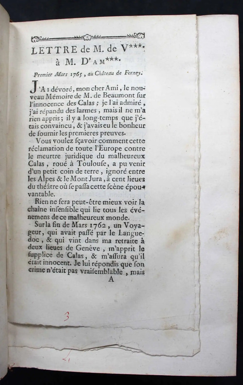 Signé par "un témoin oculaire.... ennemi du fanatisme & ami de l'égalité". Une main contemporaine à inscrit "Voltaire" à la plume. Première (?) édition. Il en existe au moins deux, une en 20 pages et l'autre en 21. Avec : - [VOLTAIRE.] Lettre de M. de V*** à M. D'Am***, premier mars 1765, au Château de Ferney. In-12 de 12 pp. Lettre à D'Amilaville sur sa rencontre avec un fils de Calas. Ces deux pièces de Voltaire se trouvent dans un ensemble de 16 pièces reliées ensemble autour de l'affaire Calas : - Mémoire à consulter, et consultation pour les enfants de défunt Jean Calas, marchand à Toulouse. Paris, Merlin, 1765, in-12, 28 pp. Signé Elie de Beaumont et sept autres avocats dont Loiseau de Mauléon. - Mémoire du sieur François-Alexandre Gualbert Lavaysse. In-12 de 31 pp. - Dupleix de Bacquencourt, Elie de Beaumont. Mémoire pour Dame Anne-Rose Cabibel, veuve Calas, & pour ses enfans, sur le renvoi aux requêtes de l'Hôtel au Souverain, ordonné par arrêt du Conseil du 4 juin 1764. In-12 de 96 pp. Le texte se termine par le rapport médico-légal. - Jugement souverain des requêtes ordinaires de l'Hôtel du Roi qui décharge Anne-Rose Cabibel, veuve de Jean Calas, marchand à Toulouse, Jean-Pierre Calas son fils, Jeanne Viguière, fille de service chez les Calas, Alexandre-François-Gualbert-Lavaysse, et la mémoire du défunt Jean Calas de l'accusation contre eux intentée. Du 9 mars 1765. In-12 de 35 pp. - Même ouvrage, édition de l'Imprimerie Royale, 1765. In-8 de 39 pp. - [Mercier, Louis-Sébastien] : Calas, sur l'échafaud, à ses juges. In-8 de 8 pp. - Elie de Beaumont. Mémoire à consulter et consultation pour les enfants de défunt Jean Calas, marchand à Toulouse. P., Merlin, 1765. In-12 de 28 pp. - Mémoire du sieur François-Alexandre Gualbert Lavaysse. In-12 de 31 pp. - Dupleix de Bacquencourt et Elie de Beaumont. Mémoire pour Dame Anne-Rose Cabibel, veuve Calas, & pour ses enfans. In-8 de 94 pp. - Mariette, Pierre. Reflexions pour Dame Anne-Rose Cabibel, veuve du Sr Jean Calas, marchand à Toulouse, Louis & Louis Donat Calas, leurs fils & Anne & Anne-Rose Calas, leurs filles, demandeurs en cassation d'un arrêt du parlement de Toulouse, du 9 mars 1762. Paris, Le Breton, 1763. In-8 de 10 pp. - Loiseau de Mauleon, Alexandre-Jérôme. Mémoire pour Donat, Pierre et Louis Calas. Paris, Le Breton, 1762. In-8 de 80 pp. - Mariette, Pierre. Réflexions pour Dame Anne-Rose Cabibel, veuve du sieur Jean Calas, Marchand à Toulouse, Louis & Louis-Donat Calas, leurs fils ; & Anne & Anne-Rose Calas, leurs filles, demandeurs en cassation d'un Arrêt du Parlement de Toulouse, du neuf mars 1762. Paris, Le Breton, 1763. In-8 de 14 pp. - Mémoire à consulter et consultation pour la dame Anne-Rose Cabibel, veuve Calas & pour ses enfans. Paris, Le Breton, 1762. 70, (1) pp. - Mariette, Pierre. Mémoire pour Dame Anne-Rose Cabibel, veuve du sieur Jean Calas, Marchand à Toulouse, Louis & Louis-Donat Calas, leurs fils ; & Anne & Anne-Rose Calas, leurs filles, demandeurs en cassation d'un Arrêt du Parlement de Toulouse, du 9 mars 1762. Paris, Le Breton, 1762. In-8 de 136 pp. Il manque peut-être un titre ou un faux-titre à certaines de ces brochures, mais non à celles de Voltaire qui ont été publiées sans. On sait que Voltaire, par ses écrits, a été plus qu'un autre, à l'origine de la révision du procès Calas et de sa réhabilitation. Accroc à la coiffe. /// In-8 de 20 pp. Basane marbrée, dos orné, tranches rouges. (Reliure de l'époque.) ////