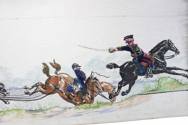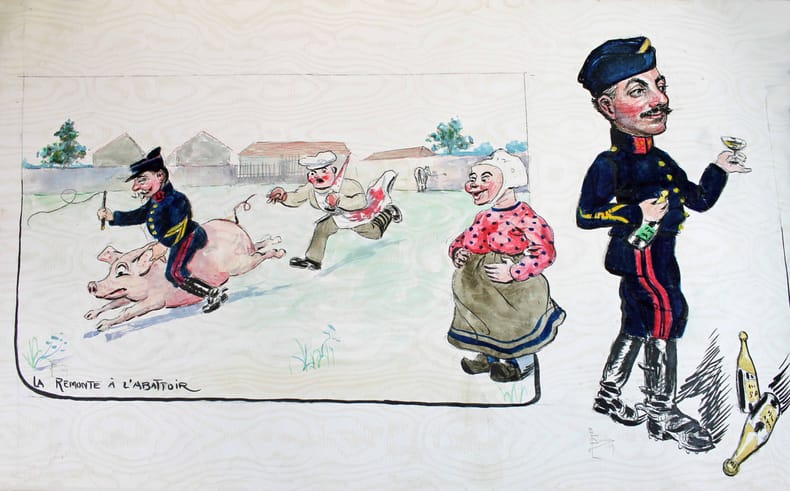 Caricature originale peinte à la gouache sur la cavalerie française, sur un rouleau de papier peint, d'environ 6,5 mètres de long. Il illustre la remonte pour la cavalerie. Fait à Valence en 1915 et signé J. Barbier. /// de //// Original caricature painted in gouache about the French cavalry, on a roll of wallpaper, around 6,5 meters long. It shows the supply of horses ("la remonte") for the cavalry. Made at Valence in 1915 and signed J. Barbier. /// PLUS DE PHOTOS SUR WWW.LATUDE.NET
