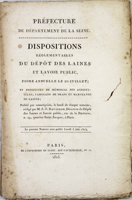 Première édition. Davallon était le directeur du Dépôt des laines et lavoir public. /// In-8 de 44 pp. Cousu sur brochure. ////