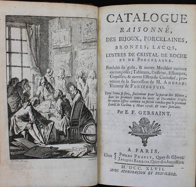 Illustré d'un frontispice gravé de Cochin. Important catalogue de vente publique rédigé par le célèbre marchand d'art Gersaint. Hormis des tableaux de maîtres (Breughel, Lorrain, Rubens...), aujourd'hui dans des collections publiques, le noyau de la collection fut constitué par les pièces provenant d'un legs de l'oncle maternel de Fonspertuis, Crespin Du Vivier, dont une très importante et prestigieuse collection de porcelaine de Chine. Avec un essai de 48 pages de Gersaint sur la porcelaine à la fin. On trouve relié à la suite 4 pièces amusantes, de la littérature "poissarde" de Vadé. La dernière contient une "Liste des plus rares curiosités trouvées dans un des magasins de Halles". On y lit : "Une Pierre Philosophale, qui devient invisible quand on veut s'en servir" ou "Une pendule qui marque l'heure d'emprunter & jamais celle de rendre". - VADE, Jean Joseph, La pipe cassée, poème épitragipoissardiheroicomique. Paris, Duchesne, [vers 1760]. 48 pp. - Les Quatre Bouquets poissards. Paris, Duchesne, [entre 1788 et 1796]. 24 pp. - Lettres de La Grenouillère, entre Jerosme Dubois, pêcheux du Gros-Caillou, et Nanette Dubut, blanchisseuse de linge fin. Suite des Quatre Bouquets. Paris, Duchesne, 1756. 46, (2) pp. - Le déjeuner de la rapée ou discours des Halles et des Ports. 86 pp. Une fente au bas de la seconde charnière sur 2 cm. Bon exemplaire. /// In-12 de frontispice, XVI, (4), 306, LV, (1) pp. Veau marbré, dos à nerfs orné. (Reliure de l'époque.) ////