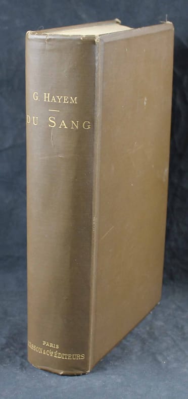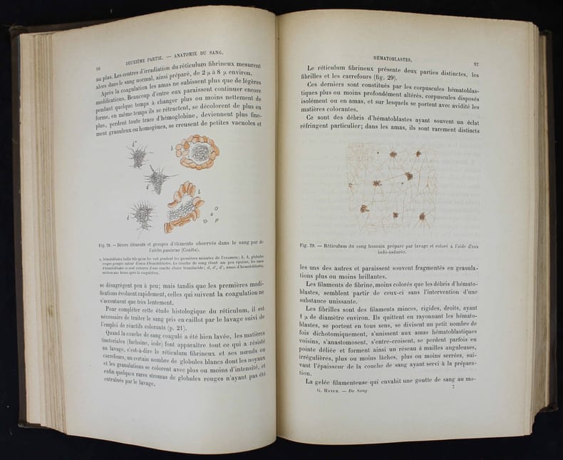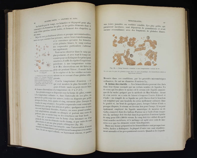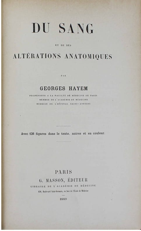 Première édition du premier traité moderne d'hématologie. Illustré par 126 figures dans le texte, certaines en partie coloriées. Très bon exemplaire. In-4 de XXVI, 1035 pp. Cartonnage toilé de l'éditeur. - - - - - - - - - - - - - - - - - - - - First Edition. Hayem's "great work 'Of blood and its anatomical alterations', which appeared in 1889, and which he proudly called a 'long original memoir', constitutes for future generations a monument to contemplate with admiration." Dreyfus, Some Milestones in the History of Hematology, pp. 78. Illustrated by 126 engravings in text, some partly colored. Garrison-Morton 883 : "Includes (pp. 614-751) an important account of chlorosis; Hayem, by his accurate observation, placed knowledge of the disease on a firm basis." Very fine copy. -