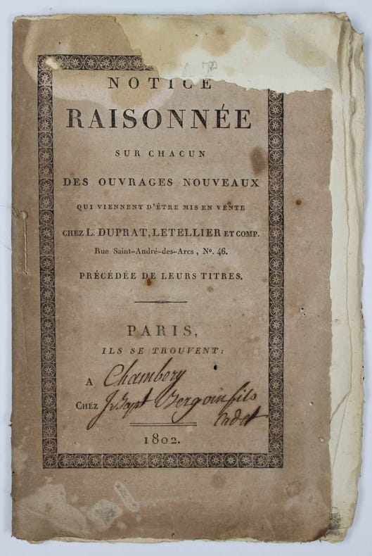 Catalogue des éditeurs Duprat et Letellier, distribué par les libraires de province, comme ici à Chambéry. On lit sur la couverture : "Ils se trouvent à" [écrit à la plume :] "Chambéry chez Joseph Bergoin fils cadet." Une notice de 2 à 4 pages pour les 11 livres proposés. Galerie de vers dans la marge, manque un morceau en haut de la couverture. /// In-8 de (2), 30, (2) pp. Broché, couverture imprimée. //// Catalogue of bookseller.