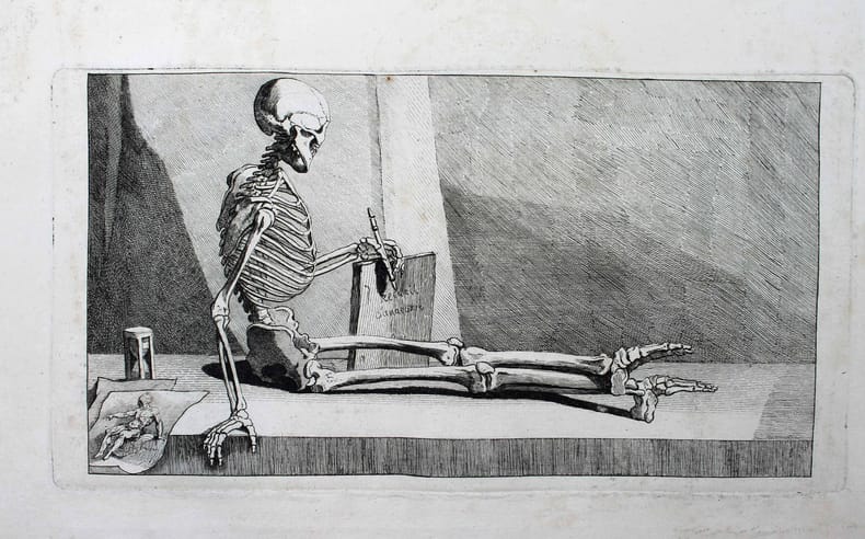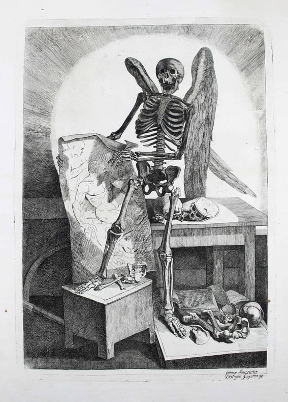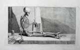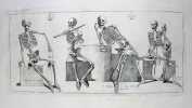 Seule édition de ce splendide ouvrage illustré de deux frontispices, un portrait, 82 planches à pleine page et 11 vignettes dans le texte. EXEMPLAIRE COMPLET de toutes ses planches et du très rare PROSPECTUS. Jacques Gamelin (1738-1803), natif de Carcassonne s'était installé à Toulouse où il avait organisé un atelier de dissection en vue de l'oeuvre qu'il voulait réaliser : un monument consacré à l'ostéologie et à la myologie. Dans cet atelier, entouré de préparateurs pour la dissection, il dessinait et gravait lui-même ses compositions les plus difficiles, particulièrement les tableaux historiques et les scènes de genre, aidé par deux de ses meilleurs élèves Martin et Lavallée. " L'ostéologie montre une série de très belles compositions à l'eau-forte qui donnent à l'ouvrage toute son originalité et dont certaines représentant des scènes animées, font penser à Rembrandt et à Goya. C'est Rembrandt qui est évoqué dans le frontispice où Gamelin a réuni autour d'une table portant des pièces anatomiques, maîtres et élèves enturbannés à l'orientale. C'est Goya que font présager ces fantaisies macabres par lesquelles l'auteur s'est plu à frapper l'imagination." Tiré à 200 exemplaires, ce livre ne connut aucun succès dans le monde médical et l'auteur s'y ruina. "Cependant les peintres et les sculpteurs surent reconnaître en Gamelin un maître du burin, un aquafortiste remarquable, et son livre est enfin sorti de l'ombre où il a été tenu pendant des années." (Hahn, Dumaitre). Des restaurations à la reliure, les pages de gardes ont été renouvelées, le frontispice de la seconde partie a subi quelques restaurations et a été doublé. Bon exemplaire. /// In-folio de prospectus, frontispice, titre, portrait, 24 ff., 41 planches / Frontispice, titre, 12 ff., 41 planches. Demi-veau brun. (Reliure du XIXe.) //// First edition. Complete copy, including the rare Prospectus. Illustrated with two frontispieces, one portrait, 82 full-page plates and 11 vignettes in text. "Without contest the most beautiful of all anatomies for the artists and one of the most remarkable books of its time. The plates in this work are more fantastic than any other anatomy, suggesting the work of Goya, who may have known or studied with Gamelin since Gamelin taught in Rome during the time Goya was there." (Garrison-Morton 401-1) Jacques Gamelin (1738-1803), born in Carcassonne, had settled in Toulouse where he had organized a dissection workshop in view of the work he wanted to realize: a monument dedicated to osteology and myology. In this workshop, surrounded by preparators for the dissection, he drew and engraved himself his most difficult compositions, especially the historical paintings and the genre scenes, helped by two of his best students Martin and Lavallée. "Osteology shows a series of very beautiful etching compositions that give the work its originality and some of which, representing animated scenes, are reminiscent of Rembrandt and Goya." With a print run of 200 copies, this book was not successful in the medical world and the author went broke. Restorations to the binding, the endpapers have been renewed, the frontispiece of the second part with some restorations and lined. A good copy. Complete copy, including the rare Prospectus. Norman 872.