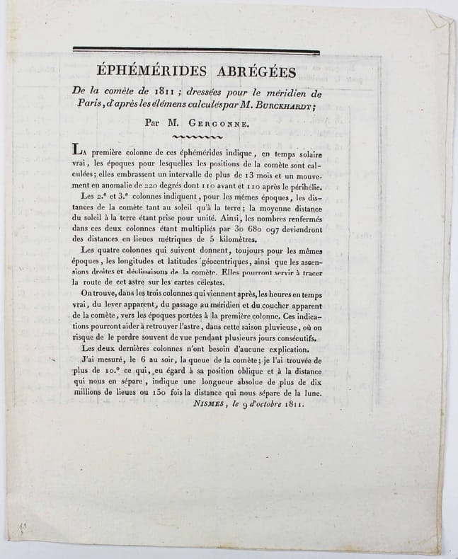 Un tiré à part des "Annales de Mathématiques pures et appliquées" (1811), dont Gergonne était le fondateur. Joseph Diez Gergonne (1771-1859) était mathématicien et enseignait alors à Nimes. En 1816, il occupa la chaire d'astronomie de l'université de Montpellier. A la fin de l'explication des éphémérides, Gergonne écrit qu'il a mesuré le 6 au soir, la queue de la comète, "je l'ai trouvée de 10 degrés ... 150 fois la distance qui nous sépare de la lune. Nisme, le 9 d'octobre 1811." /// In-4 de 3 pp. En feuille. //// Off print of "Annales de Mathématiques pures et appliquées". No copy in OCLC.