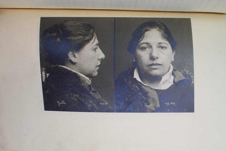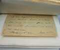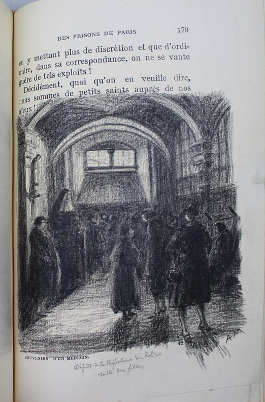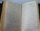 Exemplaire de l'auteur, un des 10 sur grand papier de Hollande, truffé de nombreuses photographies ou lettres autographes des prisonniers célèbres qu'il a soigné et de 60 dessins originaux d'Albert Morand, certains rehaussés de couleurs, plus un portrait hors-texte. - Une lettre autographe signée de Jeanne Tichelly, femme de chambre à l'hôtel Meurice, accusée d'espionnage au profit des allemands, à son fils qui est soldat au front. Elle avait été condamnée à mort et sera exécutée. : "j'ai pas donné des renseignements ... je conte sur toi mon fils, que tu sauve ta malheureuse mère, je fais que de pleurer jour et nuit, et je souffre énormément, que tu écrive une gentille petite lettre au Gouverneur militaire pour les accusations qui sont portez contre moi." (nous avons conservé l'orthographe). (6 pages et une enveloppe d'expédition, avec le tampon "le destinataire n'a pu être atteint") - 2 lettres autographes signées de Mata-Hari adressées au Docteur Bizard durant sa détention à Saint-Lazare : - "Je n'en peux plus. Il me faut de l'air et un peu de mouvement. Cela ne les empêche pas de me tuer s'ils le désirent." - "Voulez vous avoir la bonté de me donner un ou deux cachets de Veronal, j'ai tant envie de dormir et le sommeil ne vient pas malgré tous vos cachets. Je suis si fatiguée et je réfléchis toute la nuit. Je vous en prie faites que je puisse dormir toute une nuit. "- - 8 photos originales de Mata-Hari, à diverses âges de sa vie, et la dernière étant la photo originale du service anthropométrique de la prison et 4 cartes photos colorées de Mata-Hari en costumes de scène. - Un feuillet dépliant contenant 4 dessins, titré "Puissance de l'argent !" et signé "Souvenirs au Dr Bizard. Geneviève Berton". Jeune anarchiste de 21 ans, Geneviève Berton abattit Maurice Plateau, secrétaire de rédaction à lAction française. Elle a été adulée par les surréalistes et sa photo apparaît dans le N°1 de la "Révolution surréaliste". Elle sera curieusement acquittée. - Un billet autographe de Bolo-Pacha. Paul Bolo, grand escroc et séducteur, qui se compromis avec des banques allemandes en vue de racheter des journaux français, afin de les inciter à manipuler l'opinion publique en faveur de la paix. Il a été exécuté en 1918. - Une photo originale de la prison de la santé. - Une lettre d'une jeune fille de 20 ans, suppliant une tenancière de bordel de la faire travailler dans son établissement : "Je ne suis pas experte en amour mais ne demande qu'à le devenir." - Une lettre d'un femme à son époux, un poilu dans les tranchées, pour lui annoncer qu'elle a la syphilis, mais apparement elle ne connaît pas ce mot. Le docteur "m'a dit que j'avais attrapé ça en t'embrassant." Le texte de ces deux lettres est reproduit dans l'ouvrage. Le Dr Bizard nous raconte ses souvenirs de Saint-Lazare, la prison des femmes, de la Santé, prison des hommes, et de son quartier pour les "politiques", de la Petite Roquette, celle pour les enfants. Et des patients célèbres qu'il a pu rencontrer. Il s'étend longuement sur le beauté (discutable selon lui) de Mata-Hari, sur ses derniers moments et son éxécution. Ce sujet, qui a passioné le public à cette époque, a sans doute compté pour le grand succès qu'a connu son livre. La dernière partie de l'ouvrage est consacré aux maisons closes et à la prostitution, avant, pendant et après la guerre de 14. Albert Morand, artiste peintre, a illustré au fusain et à la mine de plomb cet exemplaire. Il illustrera aussi un autre ouvrage de Léon Bizard : "Histoire de la prison de Saint Lazare du Moyen âge à nos jours", publié en 1927. Il est possible que les illustrations de ces "Souvenirs" étaient un projet pour une édition illustrée qui n'a finalement jamais été publiée. D'après une note manuscrite en tête de volume, on a incrusté dans les seconds plats, formant encadrement, "des brins de la corde avec laquelle fut liée Mata-Hari au moment de son exécution." Les couvertures et le dos ont été reliés, ainsi qu'in-fine les couvertures de la "24e édition." Exemplaire unique ! /// In-8 de 237 pp., 9 planches h.-t. Maroquin brun incustré de pièces représentant une porte de prison, dos à nerfs, gardes de soie moirée, corde incrustée au contre-plat, tranches dorées, couvertures et dos conservés. (Reliure de l'époque, Blanchetière.) //// Author's copy, one of 10 on large Hollande paper, with numerous photographs or autograph letters from the famous prisoners he cared for, and 60 original drawings. With autographs letters and originals photographs of the famous spy Mata-Hari. And an original drawing by a young 21-year-old anarchist, Geneviève Berton who shot down the secretary of the rightist newspaper 'Action française' and who was adulated by the Surrealists, her photo was published on the cover of No.1 of the 'Révolution surréaliste'.