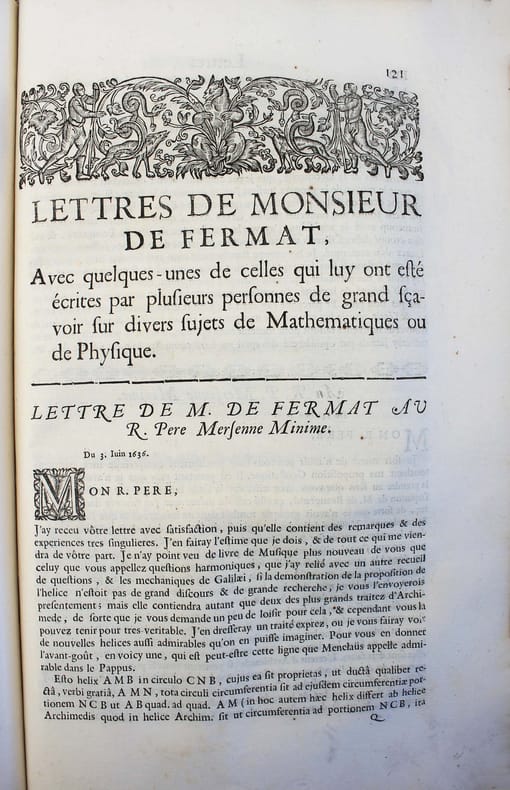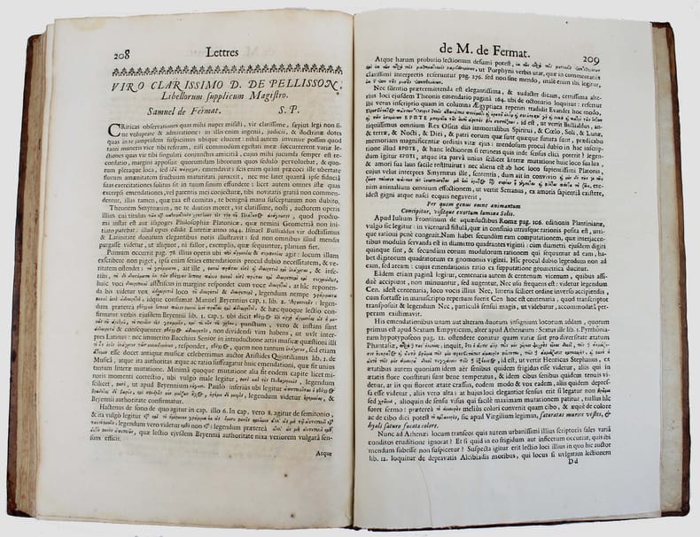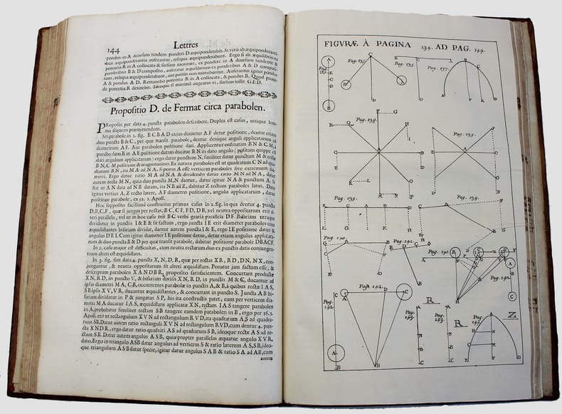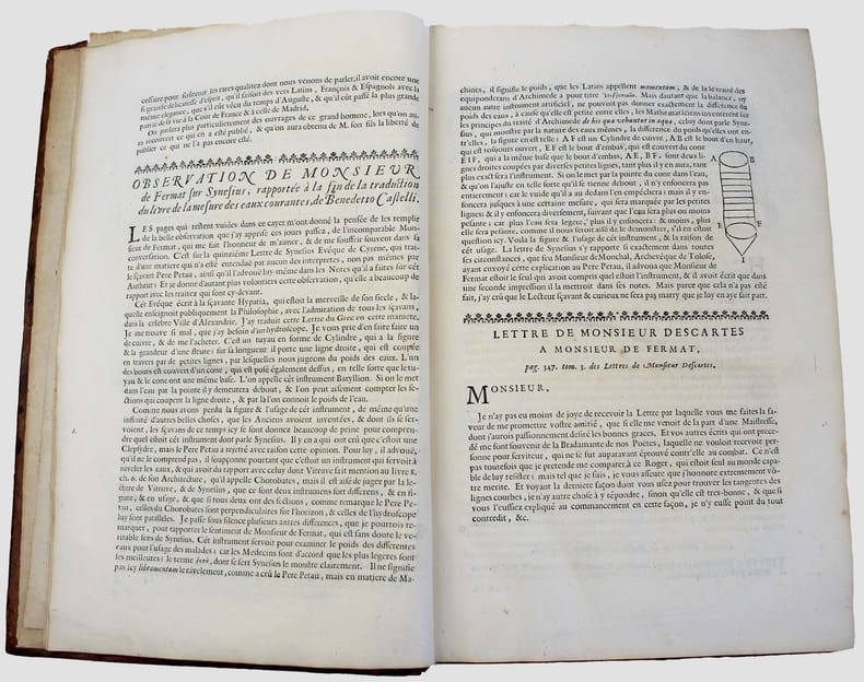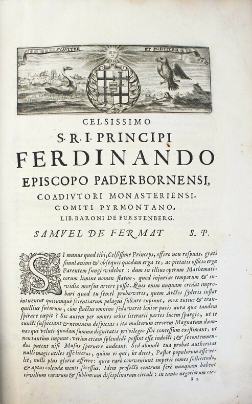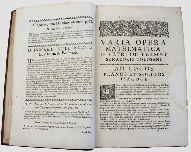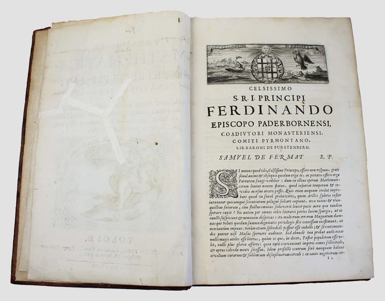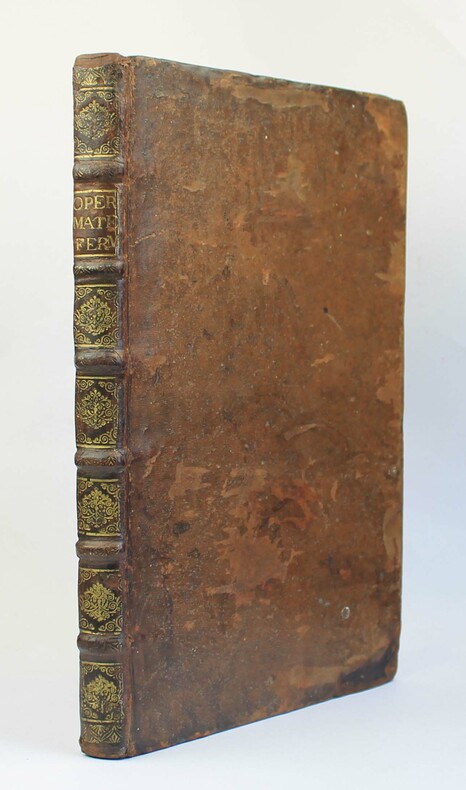 Première édition. Premier tirage avec la page de titre ornée d'une gravure sur cuivre et non d'un fleuron gravé sur bois comme dans le second tirage et les feuillets a2 et e2 avec un ornement gravé sur cuivre en tête. Ce recueil contient la majorité des oeuvres mathématiques de Pierre de Fermat (1601-1665). Elles sont ici publiées pour la première fois. "Après sa mort, les oeuvres et la correspondance que publie son fils Samuel ne représentent qu'une partie de sa production. Mais ce qui nous reste suffit pour classer Fermat au rang des plus grands mathématiciens de tous les temps" (Daumas, Histoire de la science). Les travaux publiés ici sont en latin, mais la plupart de sa correspondance est en français. Exemplaire sans le portrait, comme la plupart des exemplaires, et ceux des bibliothèques Horblit, Honeyman et Norman. Des déchirures sur le feuillet de titre consolidées au verso. Trois planches sont en facsimilé [les planches en regard des pages 134, 144 et 166] ainsi que 3 feuillets [feuillet H3 (p. 61/62), feuillet Dd1 (pp. 209/210), feuillet Ee2 (le dernier feuillet)]. Ces planches et feuillets facsimilés proviennent d'une édition soigneusement exécutée et publiée en 1861. Les photos 13, 14, 19 et 20 montrent des pages en facsimilés. Reliure frottée. Provenance : Monastère de Saint-Sever (Landes) de la congrégation de Saint-Maur (inscription sur le titre de 1702 et sur la tranche de l'ouvrage). Cet exemplaire a donc des défauts, mais son prix est très raisonnable, compte tenu du prix des exemplaires qui se sont vendus ces dernières années. En français dans le texte 115. /// In-folio de (12), 210, 1 f. bl., (4) pp., 5 planches dépliantes. Basane brune, dos à nerfs orné. (Reliure de l'époque.) //// First edition. First issue with a copper engraving on title - there is a woodcut ornament in 2nd state - and folios a2 and e2 with engraved headpieces. This collections marks the first publication of the majority of Fermat's mathematical papers, as well as his correspondence with Mersenne, Roberval, Pascal, Gassendi, and other contemporary mathematicians. For reasons that are still not clear, Fermat never wrote for publication, but restricted himself to circulating his ideas via letter and manuscript, and insisted on complete anonymity for the few works of his that made it into print during his lifetime." (Norman). After his death, the works and correspondence published by his son Samuel represent only a part of his output. But what remains is enough to rank Fermat among the greatest mathematicians of all time (Daumas, Histoire de la science). The works presented here are in Latin, though most of Fermat's correspondence is in French. This copy lacks the portrait, as do the majority of known examples, including those in the Horblit, Honeyman, and Norman collections. Small tears to the title page have been repaired on the verso. Three plates (opposite pp. 134, 144, and 166) and three leaves (H3, pp. 61/62; Dd1, pp. 209/210; Ee2, the final leaf) are supplied in facsimile, taken from a carefully executed edition published in 1861. Photos 13, 14, 19, and 20 show facsimile pages. Binding somewhat rubbed. Provenance: Monastery of Saint-Sever (Landes), Congregation of Saint-Maur (inscriptions on the title page, dated 1702, and on the edge of the book).This copy has some defects, but its price is very reasonable, considering the price of copies sold in recent years.