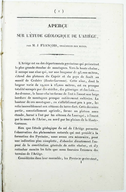 Rare tiré à part des "Annales agricoles, littéraires et industrielles de l'Ariège". A la fin : Ussat, le 11 Avril 1841. Jules François (1808-1890), qui se fera appeler par la suite François de Neufchâteau, a été ingénieur en charge des Mines de l'Ariège. Il a publié en 1843 : "Recherches sur le gisement et le traitement direct des minerais de fer dans les Pyrénées et particulièrement dans l'Ariége, suivies de considérations historiques, économiques et pratiques sur le travail du fer et de l'acier dans les Pyrénées." Inconnu de Labarère. /// In-8 de 26 pp. Broché, détaché d'un recueil. ////