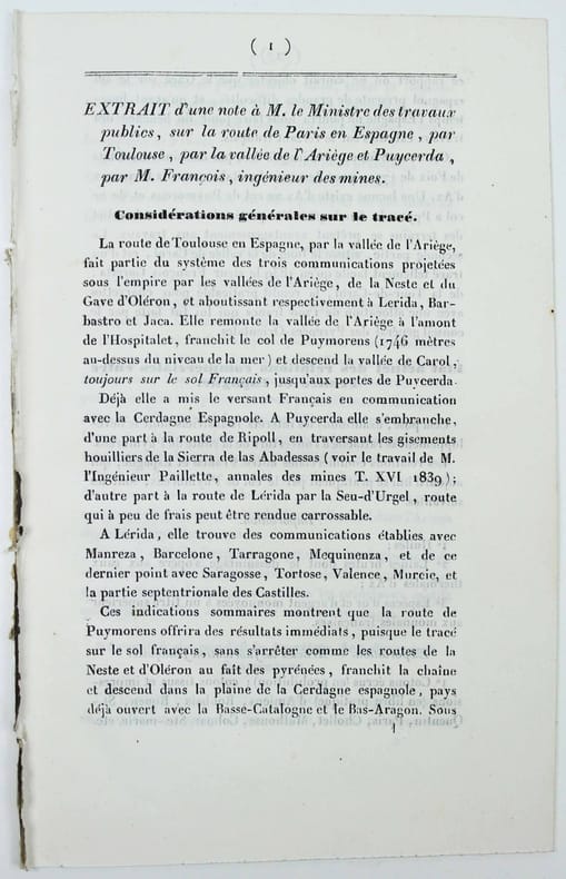 Un tiré à part, probablement des "Annales agricoles, littéraires et industrielles de l'Ariège". Jules François (1808-1890), qui se fera appeler par la suite François de Neufchâteau, a été ingénieur en charge des Mines de l'Ariège. Il a publié en 1843 : "Recherches sur le gisement et le traitement direct des minerais de fer dans les Pyrénées et particulièrement dans l'Ariége, suivies de considérations historiques, économiques et pratiques sur le travail du fer et de l'acier dans les Pyrénées." Inconnu de Labarère. /// In-8 de 12 pp. Broché, détaché d'un recueil. ////