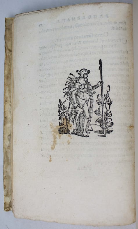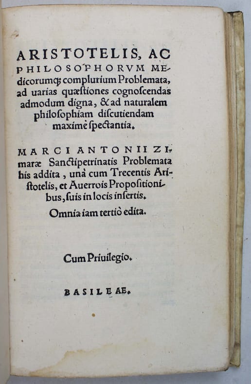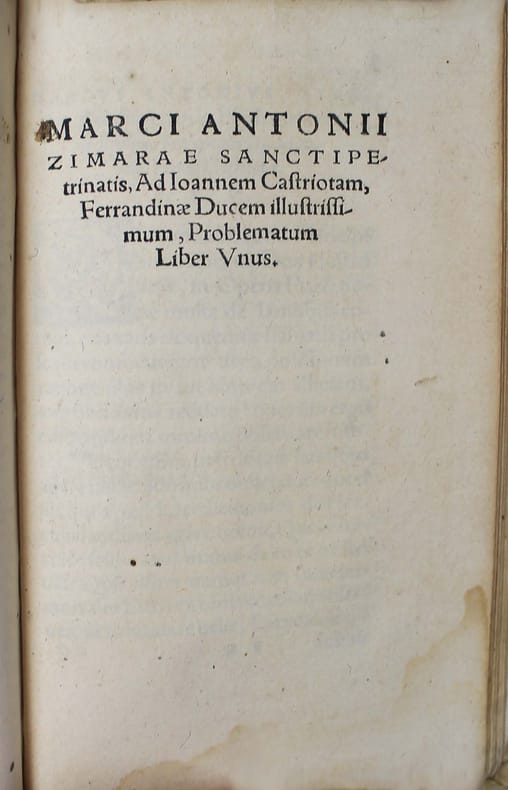 Rare édition. La seconde partie porte un faux titre : Marci Antonii Zimarae Sanctipetrinatis, Ad Joannem Castriotam, Ferrandinae Ducem illustrissimum, Problematum liber unus. Marque gravée de Robert Winter au dernier feuillet. VD16 P 4881. /// In-8 de 126 pp., 1 f. bl., 55, (1) pp. Vélin ancien. //// Rare edition. The second part has half-title: Marci Antonii Zimarae Sanctipetrinatis, Ad Joannem Castriotam, Ferrandinae Ducem illustrissimum, Problematum liber unus. Engraved mark of Robert Winter on the last folio. VD16 P 4881. No copy in North-America in Worldcat.