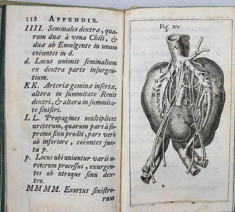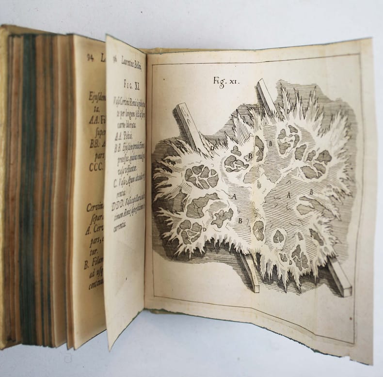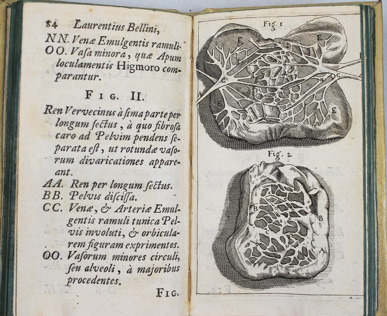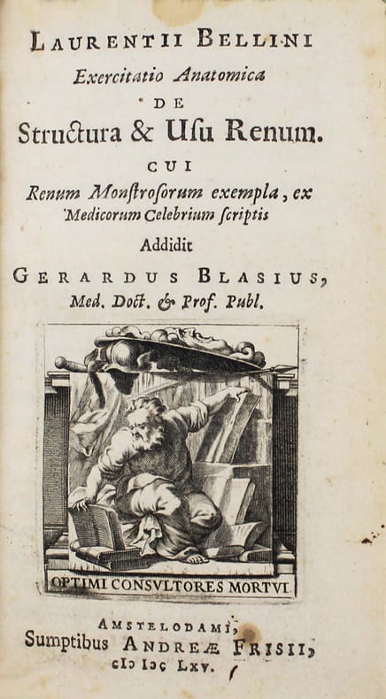 Krivatsy 1073. – Vgl. Hirsch-H. I, 446, Waller 868 und Garrison-M. 1229: «Classical description of the gross anatomy of the kidney». – Dritte Ausgabe, gegenüber der ersten Auflage von 1662 hier erstmals mit dem «Appendix ad tractatum renibus». Bellini beschrieb als Erster die Beschaffenheit der Nieren (Bellinische Röhrchen) und stellte eine Theorie zur Urinsekretion auf. – Einband leicht fleckig.