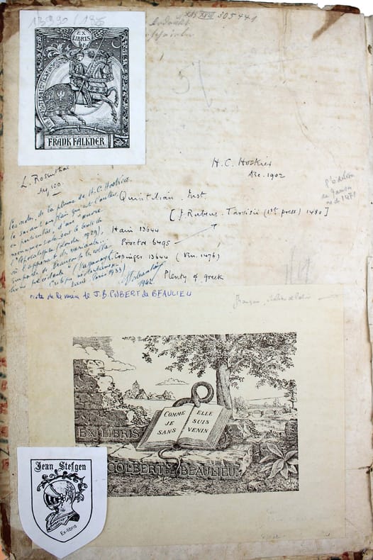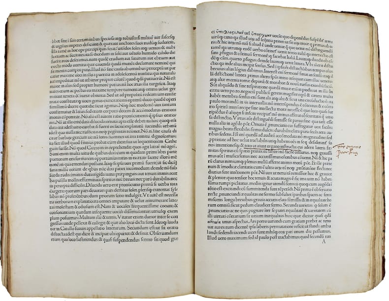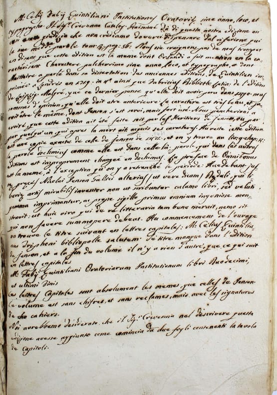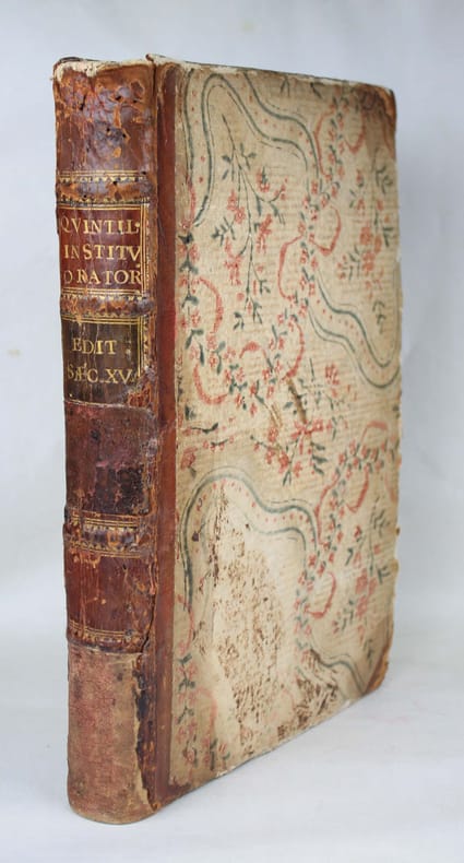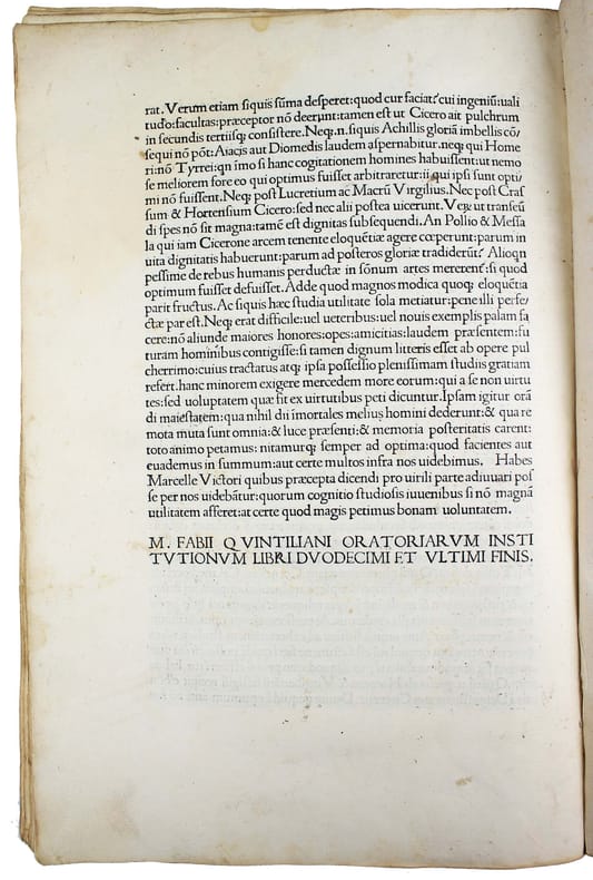 L'imprimeur Johannes Rubeus Vercellensis ou Giovanni Rosso était originaire de Verceil (Vercelli, Piémont). On ne sait pas exactement si ce livre a été imprimé à Trévise ou à Venise. Johannes Rubeus ayant exercé l'imprimerie à Trévise en 1480 puis à Venise en 1482 avant de retourner à Trévise en 1482-1485 puis à Venise de 1486 à 1519. Cette édition reprend le texte de l'édition publiée par Nicolas Jenson à Venise en 1471. Elle a été préparée par l'humaniste Ognibene, alias Omnibonus Leonicenus (1420-1500) qui professait les belles-lettres à Venise. Orateur romain du 1er siècle apr. J.-C Quintilien expose dans ce texte sa conception de la rhétorique comme l'art de bien dire : " bene dicendi scientia". Une note manuscrite d'une page, en français et en italien, sur cette édition, probablement de Herman Charles Hoskier (18641938), qui a acheté ce volume à Ludwig Rosenthal. Autres provenances : - Frank Falkner (ex-libris) - Jean-Baptiste Colbert de Beaulieu (ex-libris et une note). - Jean Stessgen (ex-libris). Le dernier feuillet blanc manque. Des restaurations un peu sommaires sur le dos. /// In-folio de (201) ff. Demi-veau brun à coins, plats de papier dominoté, dos à nerfs orné. (Reliure italenne du XVIIIe.) //// The printer Johannes Rubeus Vercellensis or Giovanni Rosso was from Vercelli, Piedmont. It is not clear whether this book was printed in Treviso or Venice. Johannes Rubeus had worked as a printer in Treviso in 1480 then in Venice in 1482 before returning to Treviso in 1482-1485 and then to Venice from 1486 to 1519. This edition is based on the text of the edition published by Nicolas Jenson in Venice in 1471. It was prepared by the humanist Ognibene, alias Omnibonus Leonicenus (1420-1500), who teached belles-lettres in Venice. A Roman orator of the 1st century A.D. Quintilian explains in this text his conception of rhetoric as the art of saying well: "bene dicendi scientia". Full page note on this editio in French and Italian possibly by Herman Charles Hoskier. Provenances : Herman Charles Hoskier (18641938) biblical scholar, British textual critic who bought from Ludwig Rosenthal. - Frank Falkner (ex-libris) - Jean-Baptiste Colbert de Beaulieu (ex-libris and note). - Jean Stessgen (ex-libris). ISTC iq00028000. GW M36815. BMC VII 1137, XII 21. Goff Q28.
