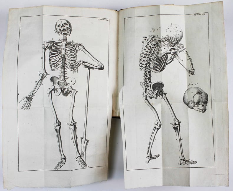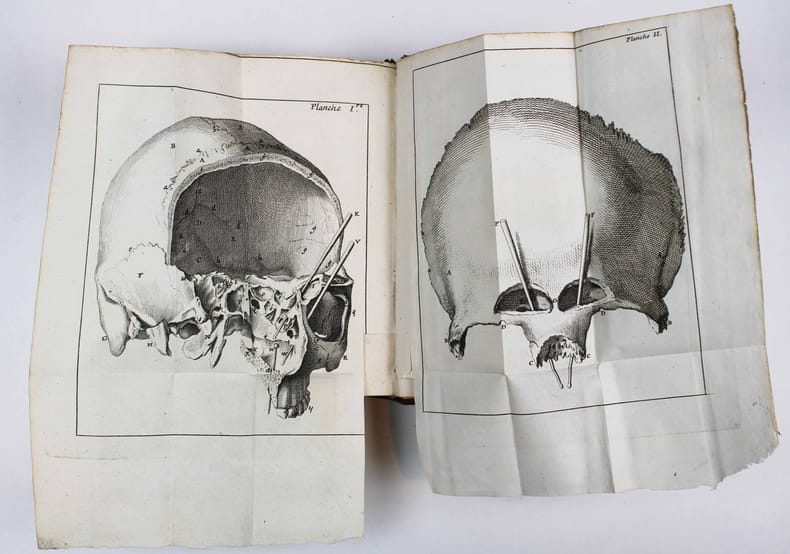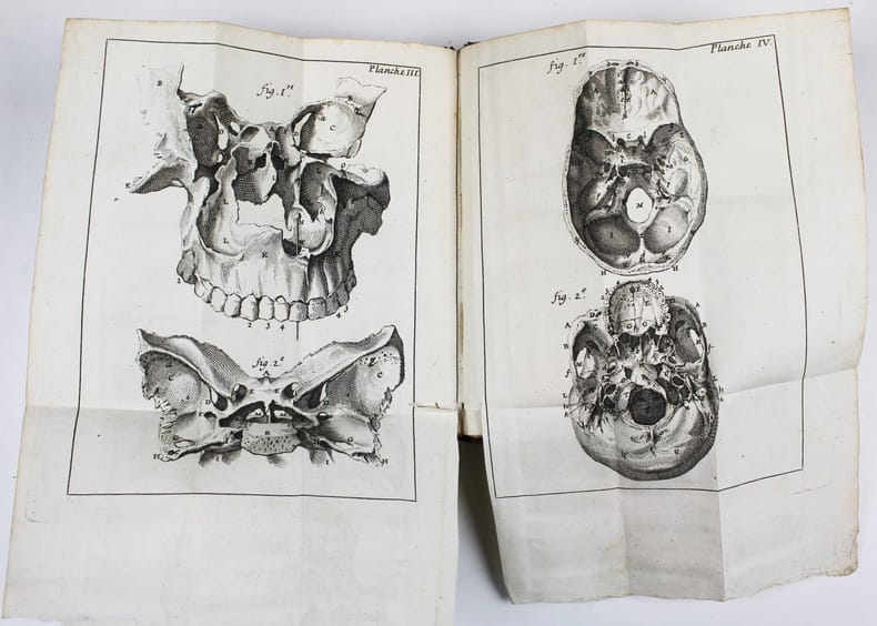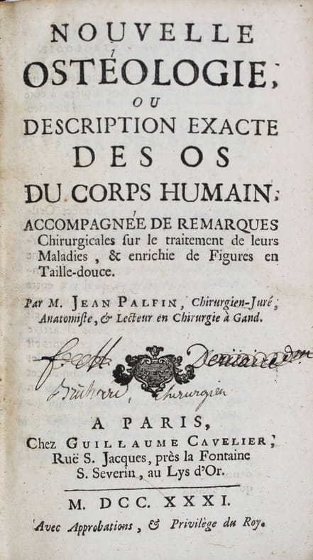Première édition en français. Cet ouvrage a paru en langue flamande à Gand en 1702, puis à Leiden en 1724. Il est "fort différent de celui qu'il a inséré dans son "Anatomie", en ce qu'il l'a enrichi de nouvelles planches qui ne se trouvent point ailleurs et de notes chirurgicales propres à bien diriger les étudiants en chirurgie." (Approbation du chirurgien Devaux). Il est illustré de 8 planches gravées en taille-douce. Ces illustrations sont donc différentes de celles qui concernent les os de l' "Anatomie du corps humain" du même auteur, publiée en 1726. C'est le premier ouvrage de Jan Palfijn. "Il y expose avec beaucoup de méthode et une précision remarquable les notions que l'on avait acquises alors sur la nature, la conformation et les maladies des os ; il a de plus le mérite d'y avoir donné des renseignements nouveaux sur les sinus de la face, les sutures du crâne et les mouvements de la mâchoire." Biographie des hommes remarquables de la Flandre tome II p. 45. Coiffes restaurées. /// In-12 de XXIV, 390, (6) pp., 8 planches h.-t. Veau brun, dos à nerfs orné, tranches rouges. (Reliure de l'époque.) //// First edition in French. This work appeared in Flemish in Ghent in 1702, then in Leiden in 1724. It is 'very different from his "Anatomy", in that he enriched it with new plates which are not found elsewhere and with surgical notes apt to direct the students in surgery.' (Approval by the surgeon Devaux). It is illustrated with 8 engraved plates. These illustrations are therefore different from those concerning the bones of the 'Anatomie du corps humain' by the same author, published in 1726. It is Jan Palfijn's first work, "He exposes with great method and remarkable precision the notions that had been acquired at that time on the nature, the conformation and the diseases of the bones; he also has the merit of giving new information on the sinuses of the face, the sutures of the skull and the movements of the jaw. Headcaps restored.