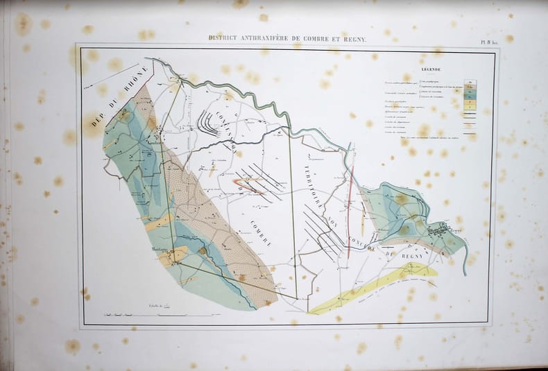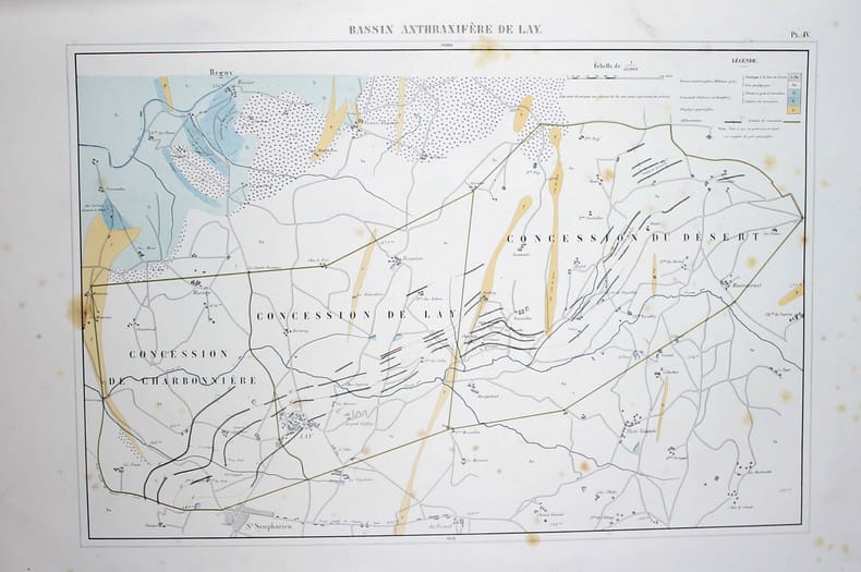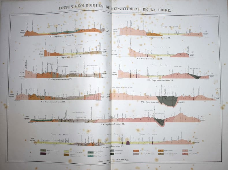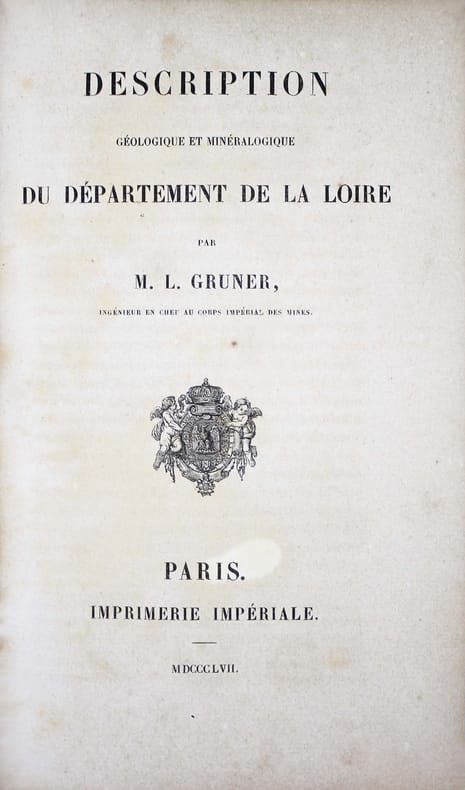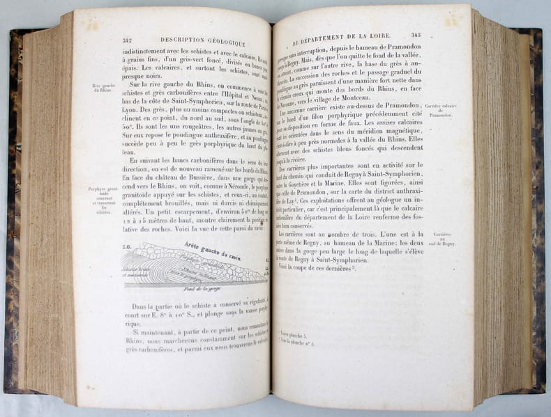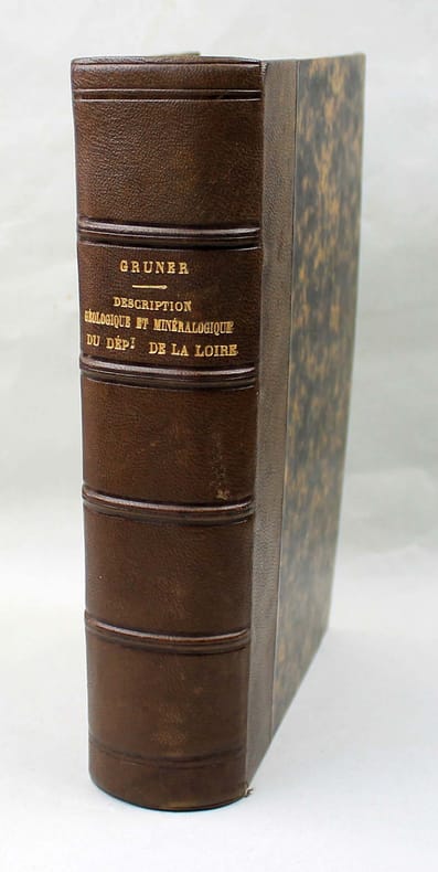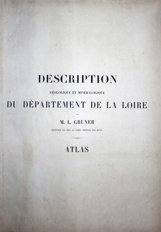 Seule édition. Complet du très rare atlas in-plano. Louis Gruner (1808-1883) était ingénieur en chef au corps impérial des mines. La carte en couleurs du volume de texte est une "carte orographique du Forez et des contrées voisines". (une déchirure sans manque). Papier un peu roussi pour le texte. L'atlas se compose ainsi : Carte géologique du département de la Loire. Coupes géologiques du département de la Loire. Bassin anthraxifère de Bully. Bassin anthraxifère de Lay. District anthraxifère de Combre et Regny. District anthraxifère d'Amions. Tableau des eaux de la Loire observées en aval du pont de Roanne pendant les années 1846 à 1856. Les deux premières et la dernière sont sur double page. Des rousseurs. Ce très grand atlas (69 x 58,5 cm) manque à la plupart des exemplaires conservés dans les bibliothèques publiques. Bon exemplaire. /// In-8 et in-plano de (4), XVI, 778, (1) pp., 1 carte dépliante / (2) pp., 7 cartes. Demi-chagrin brun, dos à nerfs pour le texte, demi-percaline pour l'atlas. (Reliures de l'époque.) //// Only edition. Complete with the very rare elephant folio atlas. Louis Gruner (1808-1883) was chief engineer at the Imperial Mining Corps. The color map in the text volume is a "carte orographique du Forez et des contrées voisines". (one tear not missing). Some foxing. This very large atlas (69 x 58.5 cm) is missing from most copies held in public libraries. A good copy.