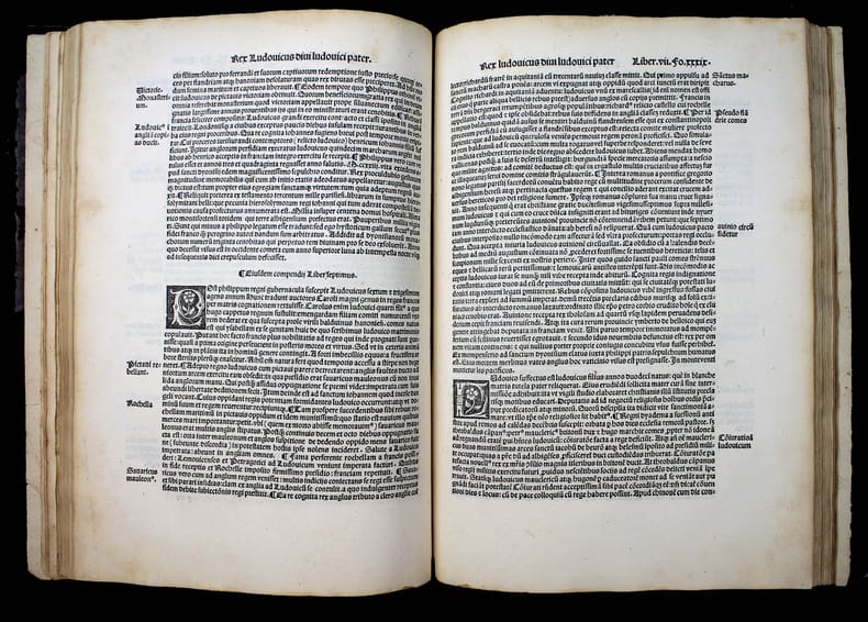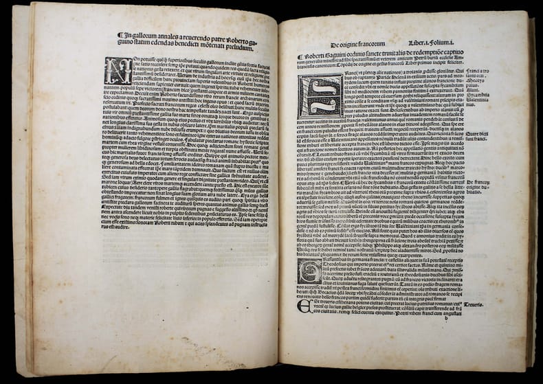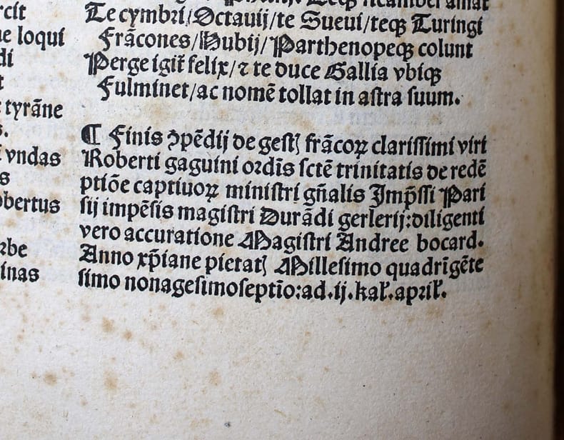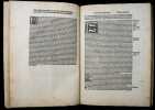 Célèbres chroniques essentiellement consacrées à ce que l'auteur connaît : la guerre de Cent ans, les guerres d'Italie, le règne de Charles VIII et de Louis XII. C'est l'oeuvre majeure de Robert Gaguin, le plus grand humaniste parisien de la fin du quinzième siècle. Disciple et successeur de Guillaume Fichet, l'introducteur de l'imprimerie en France et le restaurateur des études classiques, Gaguin avait pris la tête d'un cercle accueillant de jeunes humanistes étrangers tels que Pic de la Mirandole, Erasme, etc... Louis XI et Charles VIII le chargèrent d'importants missions diplomatiques en Allemagne, en Italie, en Angleterre et en Espagne. Troisième édition, elle suit celle de Lyon, Trechsel, 1497, qui a été révisée par Josse Bade. Elle contient une lettre d'Erasme à Gaguin et pour la première fois une lettre de Cornelius Girardus (Corneille Girard) à Gaguin et un épigramme du même. Cet ouvrage a été publié pour la première fois en 1495, par Pierre Le Dru. "Elle était si pleine de fautes que Gaguin en avait honte et avait cherché à en faire disparaitre tous les exemplaires. Badius le persuada de donner une nouvelle édition et de lui confier l'exemplaire qu'il avait préparé dans ce but, pour le faire réimprimer par Treschel, lui promettant d'apporter tous ses soins à la correction." Renouard Biblio. de Josse Badius Ascensius I, 13.) André Bocard, d'origine poitevine a connu une longue carrière d'imprimeur puisqu'il exerça durant quarante et un ans. Jusqu'en 1512, il n'a imprimé que pour d'autres libraires. "Très exigeant il ne ménage ni ses soins, ni sa sueur dans la présentation et la mise en page de ses éditions." (Renouard). Titre imprimé en noir et rouge avec la belle marque d'André Bocard en rouge. Grandes initiales à fond criblé. Il manque le dernier feuillet blanc. Papiers de garde renouvelés, de très légères rousseurs. Très bel exemplaire. /// In-folio de (4), CVIII, (1) ff. Veau brun, dos à nerfs, plats estampés. (Reliure de l'époque.) //// Contemporary brown calf, spine with nerves, boards stamped. Famous chronicle of French history essentially devoted to what the author knows: the Hundred Years' War, the Italian wars, the reign of Charles VIII and Louis XII. It is the major work of Robert Gaguin, the greatest Parisian humanist of the late fifteenth century. Disciple and successor of Guillaume Fichet, the introducer of printing in France and the restorer of classical studies, Gaguin had taken the head of a circle welcoming young foreign humanists such as Pico della Mirandola, Erasmus, etc... Louis XI and Charles VIII gave him important diplomatic missions in Germany, Italy, England and Spain. Third edition, it follows that of Lyon, Trechsel, 1497, which was revised by Josse Bade. It contains a letter from Erasmus to Gaguin and for the first time a letter from Cornelius Girardus (Corneille Girard) to Gaguin and an epigram by the same. This work was first published in 1495, by Pierre Le Dru. "It was so full of errors that Gaguin was ashamed of it and had sought to have all copies removed. Badius persuaded him to give a new edition and to entrust to him the copy which he had prepared for this purpose, to have it reprinted by Treschel, promising him to bring all his care to the correction." Renouard Biblio. de Josse Badius Ascensius I, 13.) André Bocard, of Poitevin origin, had a long career as a printer, since he practiced for forty-one years. Until 1512, he only printed for other booksellers. "Very demanding he spares neither his pains nor his sweat in the presentation and the layout of his editions." (Renouard). Title printed in black and red with André Bocard's trademark in red. Large initials on a cribbed background. The last blank folio is missing. Endpapers renewed, very slight foxing. A very fine copy. BMC VIII, 156. GW 10453. ISTC ig00013000.