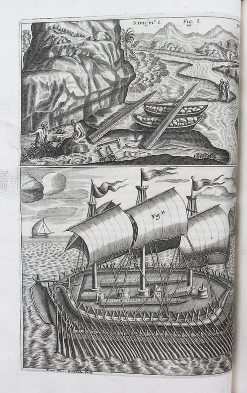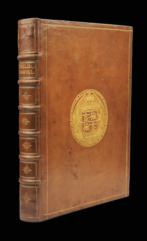 Première édition. Illustré par un frontispice gravé, une grande planche dépliante et de nombreuses gravures sur cuivre et sur bois dans le texte dont 7 à pleine page. Le pape Innocent X a érigé un obélisque devant sa maison de famille, le Palazzo Pamphili, sur la Piazza Navona. Il a chargea le père jésuite Athanase Kircher (1602-1680) de traduire les hiéroglyphes figurant sur les côtés de l'obélisque. "L'Obélisque de Pamphilius est le premier exposé complet de Kircher sur ses principes de traduction des hiéroglyphes égyptiens...". Dans cet ouvrage, Kircher maintient la méthode d'interprétation symbolique à laquelle il avait déjà fait allusion dans son "Prodromus coptus" et sa "Lingua aegyptiaca restituta". Comme la plupart des ouvrages de Kircher, ce livre est rempli d'arcanes fascinants, et les interprétations de Kircher de la mythologie et de la magie des égyptiens sont d'un intérêt particulier." (Brian Merrill, Athansius Kircher). Au début du projet, l'obélisque n'était pas intact ; en plus des cinq pièces principales, il y avait de nombreux petits morceaux qui n'ont pas été trouvés immédiatement. Dans le cadre de sa reconstruction, Kircher a rempli les espaces manquants avec les hiéroglyphes qui, selon lui, correspondaient le mieux au texte. Plus tard, les parties manquantes ont été retrouvées par des archéologues et rassemblées avec le corps principal de l'obélisque. A la stupéfaction générale, les hiéroglyphes sur ces parties étaient exactement comme il l'avait prédit. Le cardinal Capponi, qui supervisait le projet, fut si fasciné qu'il demanda que cela soit consigné par écrit, et ce fut l'origine de cet "Obeliscus pamphilius". En fait, l'étude de Kircher avait révélé que les mêmes inscriptions se répétaient sur les différentes faces de l'obélisque, et il était donc en mesure de prédire ce que l'on trouverait sur les parties qu'il n'avait pas encore vues. La traduction (erronée) de Kircher est gravée dans le granit et fixée sur les côtés du piédestal de l'obélisque, au-dessus de la fontaine de Bernini, où elle se trouve encore aujourd'hui. Très bel exemplaire aux armes de Georges Joly, baron de Blaisy, (1610-1679) second président du parlement de Bourgogne. Quelques restaurations. Très bel exemplaires. On trouve parfois dans ce livre un portrait du pape, mais comme beaucoup d'exemplaires, comme celui-ci, ne l'ont pas, il apparaît qu'il n'a pas été livré avec tous les exemplaires. Olivier 1952. /// In-folio de frontispice, (64), 560, (30) pp. Veau brun, dos à nerfs orné, armes dorées sur le plats. (Reliure de l'époque.) //// First edition. Illustrated with an engraved frontispiece, one large folding plate and numerous copper and wood engravings in text, 7 of which are full page. Pope Innocent X erected an obelisk in front of his family's house, the Palazzo Pamphili, in the Piazza Navona. He commissioned Athanasius Kircher (ca. 1602-1680) to translate the hieroglyphs on the sides of the obelisk. "The Obeliscus Pamphilius is Kircher's first complete exposition of his principles for translating Egyptian hieroglyphs... In this work Kircher maintains the symbolic method of interpretation he hinted at earlier in his 'Prodromus coptus suve aegyptiacus' and 'Lingua aegyptiaca restituta'. Like most of Kircher's works, this book is filled with fascinating arcana, and Kircher's interpretations of Egyptian mythology and lore are of particular interest." - Brian Merrill, Athansius Kircher. At the start of the project the obelisk was not intact; as well as the five major pieces there were numerous smaller pieces that were not immediately found. As part of his reconstruction, Kircher filled the missing gaps with the hieroglyphs he believed would best fit the text according to his understanding of their meaning. Later, the missing parts were found by archaeologist and brought together with the main body of the obelisk, and to everyone's amazement, the hieroglyphs on those parts were, according to Kircher himself, exactly as he had predicted. Cardinal Capponi, who was supervising the project, was so enthralled that he asked for it to be written up, and this was the origin of this "Obeliscus pamphilius". In fact Kircher's study had revealed that the same inscriptions were repeated on the different sides of the obelisk, so he was able to predict what would be found on parts he had not yet seen. Kircher's (wrong) translation is carved in granite and fixed to the sides of the obelisk's pedestal, above Bernini's fountain, where they still stand today. A very fine copy with the arms of Georges Joly, baron de Blaisy, (1610-1679) second president of the parliament of Burgundy. Some restorations. One sometimes finds in this book a portrait of the pope, but as many copies do not have it, it appears that this pope portrait was not issued with all copies. Olivier 1952.