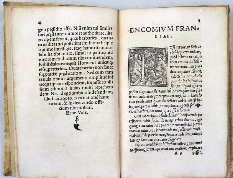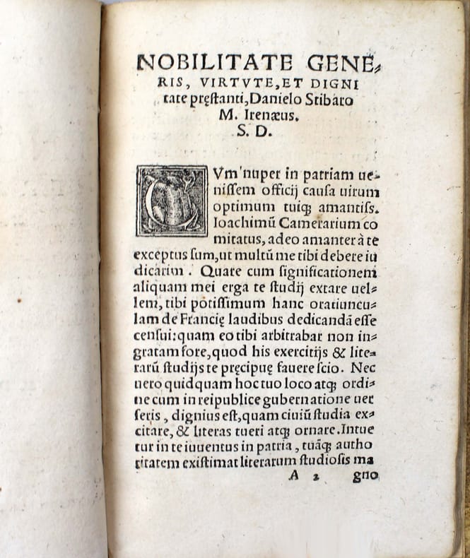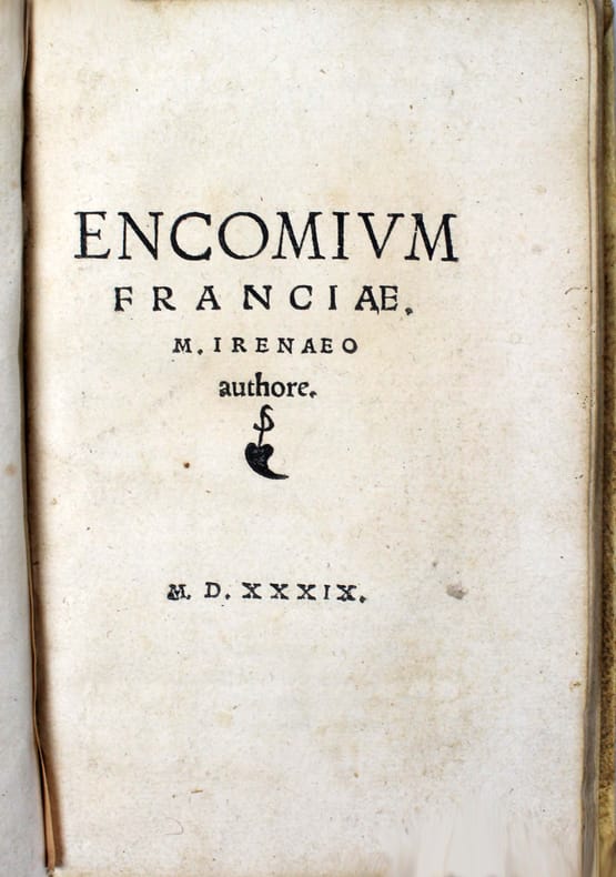 Première édition. Rare texte de Philipp Melanchthon, publié sous le pseudonyme d'Irenaeus. Aux pages 24 et 25, Melanchthon commente les travaux de l'astronome Regiomontanus. Une impressions de Crato Mylius ou Kraft Müller (Sélestat, 1503-1547) qui avait été l'élève de Philippe Melanchthon à Wittenberg. Il acquit l'atelier de Georg Ulricher d'Andlau à Strasbourg en 1536 et a été alors l'imprimeur attitré de Melanchthon. Il est mort à la bataille de Mühlberg an der Elbe, en Saxe, une victoire de Charles Quint sur les troupes protestantes. Marque gravée de Crato Mylius sur le dernier feuillet. /// In-12 de 28, (4) pp. Vélin. (Reliure ancienne.) //// First edition. Rare text by Philipp Melanchthon, published under the pseudonym Irenaeus. On pages 24 and 25 Melanchthon comments on the work of the astronomer Regiomontanus. An impression by Crato Mylius or Kraft Müller (Selestat, 1503-1547) who had been a pupil of Philip Melanchthon in Wittenberg. He acquired the workshop of Georg Ulricher d'Andlau in Strasbourg in 1536 and was then Melanchthon's appointed printer. He died at the battle of Muhlberg an der Elbe in Saxony, a victory of Charles V over the Protestant troops. Engraved mark of Crato Mylius on the last leaf. VD16 ZV 10682. USTC 646159. 2 copies in North-America : Newberry Library and Harvard.