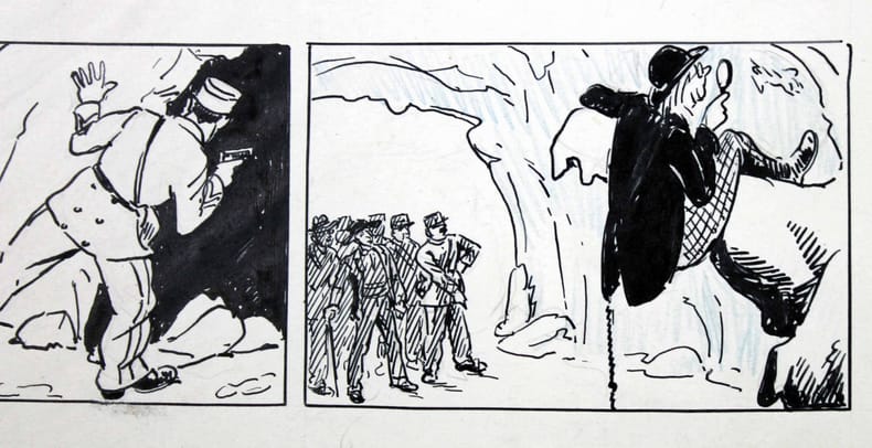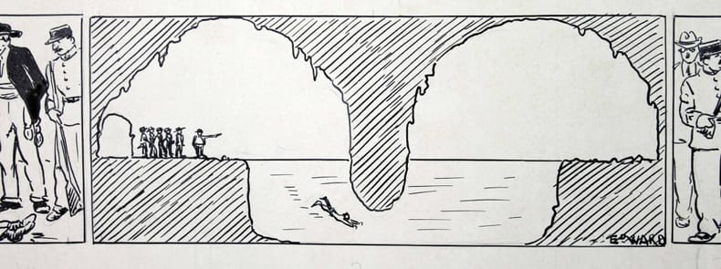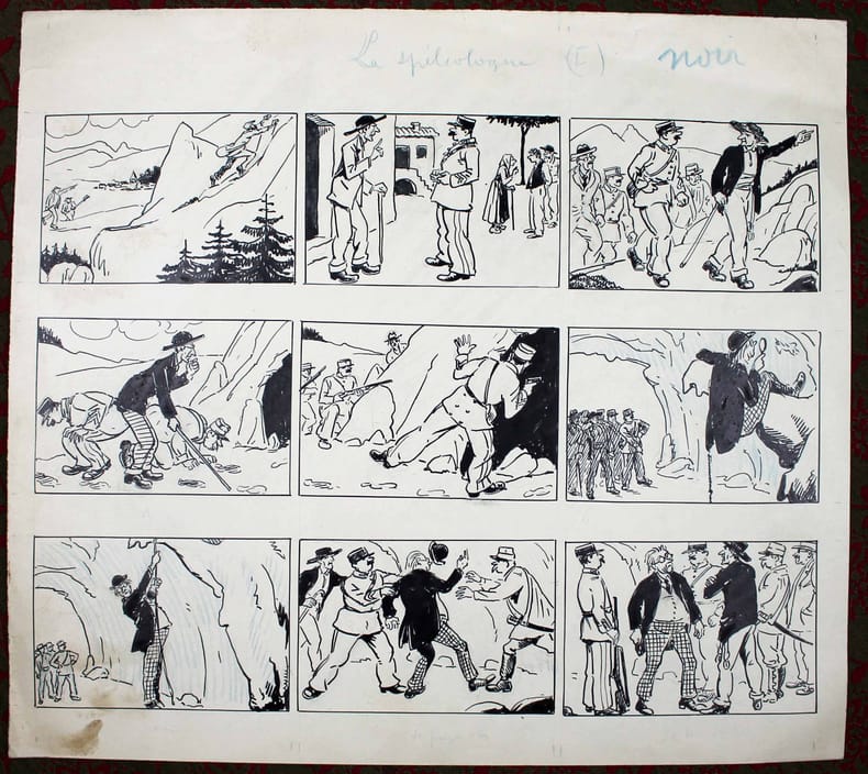 3 planches originales de bandes dessinées. Dessins à l'encre de Chine, signés "Ed Ward". Les gendarmes poursuivent un voleur, qui profite de ses connaissances spéléologiques pour s'enfuir. Dessins publiés au début du XXe dans une revue pour la jeunesse dont nous ignorons le nom. Dimension 29 x 32,5 cm pour une et 25 x 32,5 cm pour les deux autres. /// de ////