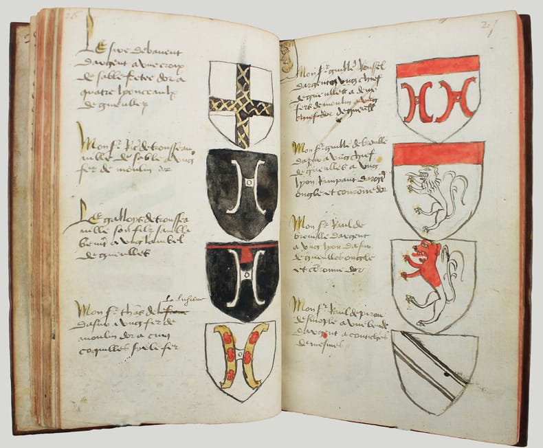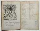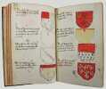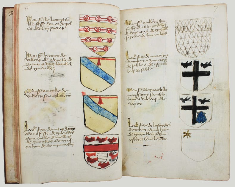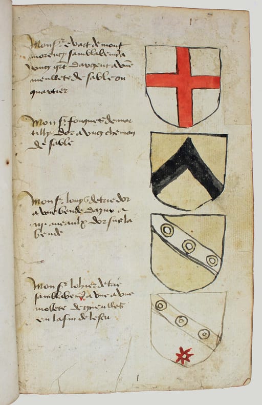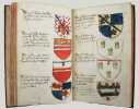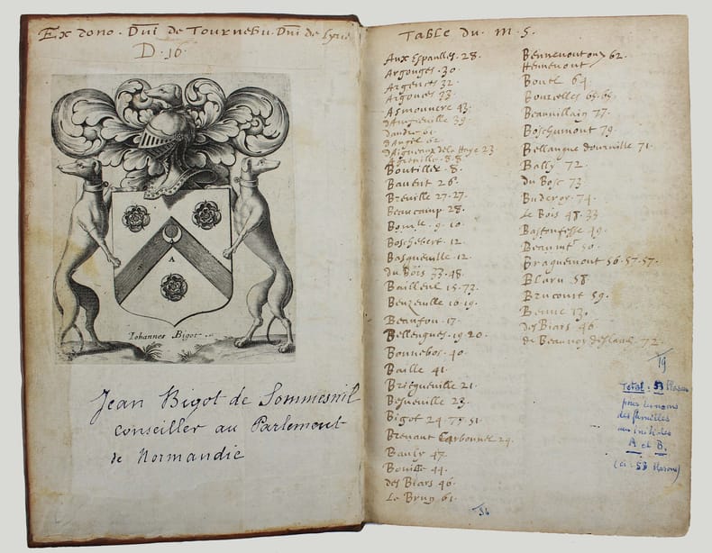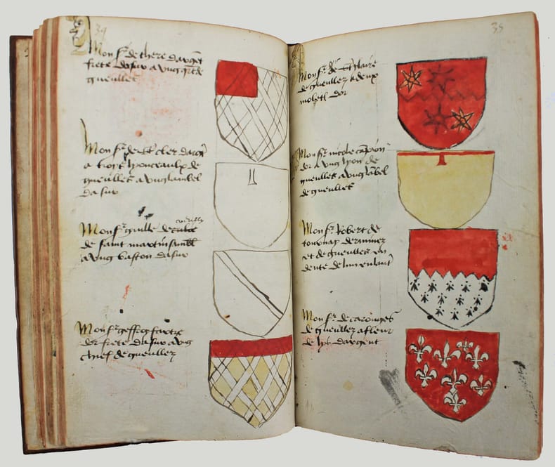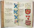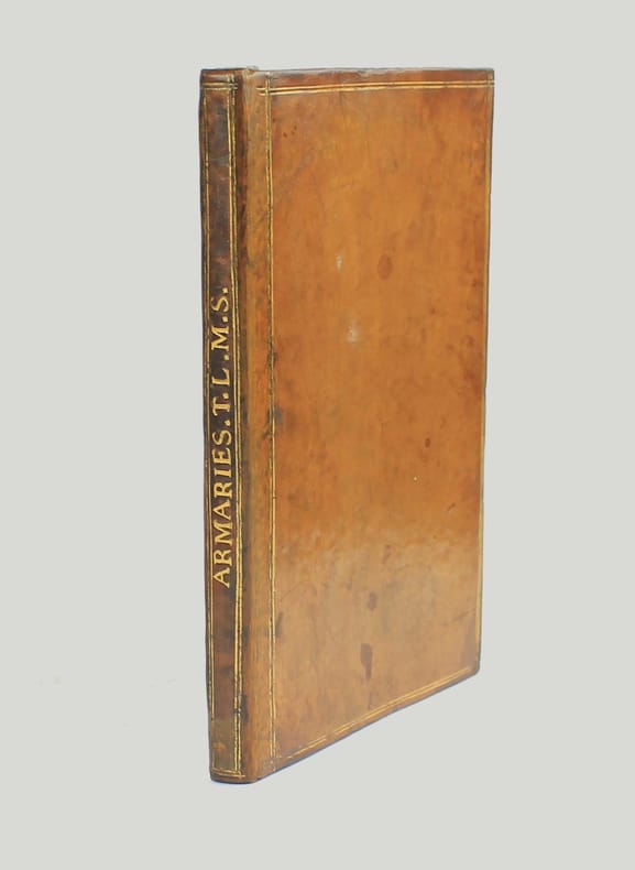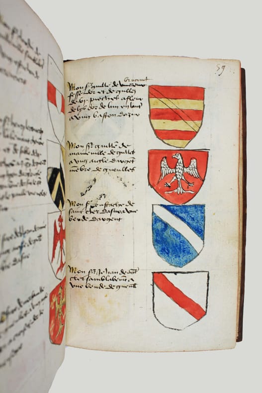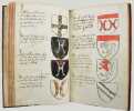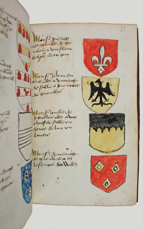 Précieux armorial manuscrit, de la fin du XVe ou du début du XVIe siècle, contenant les descriptions d'environ 300 blasons, dont 265 dessinés à l'encre et aquarellés, et 35 inachevés ou simplement esquissés. environ 230 blasons concernent la Normandie, 65 l' Ile-de-Franceet 5 se rapportent à d'autres provinces. Chaque page est divisée en deux parties: dans la partie gauche se trouve un texte, d'une écriture gothique, contenant les descriptions des blasons, et, dans la partie droite, sont représentés les blasons correspondants. En général, chaque page contient 4 blasons. Ce recueil est en grande partie consacré aux "Bacheliers", c'est-à-dire aux seigneurs qui possédaient des châteaux, forteresses et places qui dépendaient de comtés, vicomtés, baronnies ou châtellenies. Cette appellation apparaît dans le présent manuscrit en page 17. Par rapport à la hiérarchie nobiliaire, le bachelier se situait entre l'écuyer et le chevalier. L'armorial contient, en premier lieu, les blasons d'Ile-de-France(pp. 1 à 10). On recense 40 blasons, parmi lesquels Evrart de Montmorency, Fouques de Marcilly, Louys de Trie, Lohier de Trie (p. 1). - Le sire de Chambly et sa famille (3 blasons), Pierre de Villers (p. 2). - Tristan de Villers, Jehan de Garencières et son fils (2 blasons), Jehan Lestandart (p. 3). - Regnault d'Orgesuy et un parent (2 blasons, dont un esquissé), Jehan de Mesgnou, Hervieu Le Cornu (p. 5). - Richard de Court, Hervier de Villers, Arnoult de Villers, le sire de Mitry (p. 6). - Guy Le Boutiller, Pierre et Philippe de Hangeville [Angervilliers], Guillaume du Chastelier (p. 8). - Guillaume Mauvoisin, Hagueny de Bouville (p. 9). - Hagueny de Bouville, Philippe de Guyencourt (non dessiné), Jehan Le Veneur (p. 10). A la suite se trouve la partie la plus importante, consacrée aux blasons de Normandie(pp. 10 à 59). On compte environ 190 blasons, parmi lesquels: Le sire de Moullay [Molay] (p. 10). - Les sires de Boishebert, de Sernon, d'Arneval [Esneval] et de Basqueville (p. 12). - Les sires de Tournebu, de Marbeuf, de Torigny et de Beuzeville (p. 16). - Monsr. Fouques Peinel [Paynel] et trois parents (pp. 17-18). - Monsr. Guillaume de Briqueville et Guillaume de La Haye (p. 21). - Monsr. Jehan de La Haye et cinq parents (pp. 22-23). - Henri de Trousseauville et un parent; Thomas de La Luzerne (p. 26). - Monsr. de Tilly de Grenetot et trois parents (pp. 29-30). - Monsr. Pierre d'Argences, Jehan du Bois, Guillaume de Perchie [Percy], Monsr. de Meautis (p. 33). - Monsr. de Caligny, de Longy, Richard de Chaumont, Guillaume Pouchin (p. 36). - Monsr. Jehan Martel, d'Yvetot, de Bonnebosc (p. 40). - Monsr. Robert de La Plainque, Richard d'Oille [Ouilly], Pierre de Survie (43). - Monsr. de Fontenay du Mesnil Toufray, d'Urville, de Vaulx, Philippe de Harenville [Harenvilliers] (p. 47). - Baudrain de La Heuse, Guillaume de Villers du Hommet et cinq parents (pp. 53-54). - Le sire d'Estouteville (p. 55). - Monsr. Regnault de Braquemont (p. 56). - Les sires de Blaru et de Morfaville (p. 58). - Monsr. Guillaume de Brucourt, Guillaume de Manneville [Magneville] (p. 59). Viennent ensuite deux blasons d'Artois: Monsr. Eustache et Jehan de Saint-Cler (p. 59). Les pages 60 à 79 contiennent d'autres blasons d'Ile-de-France (environ 25) et de Normandie (environ 40). Pour l'Ile-de-France, on relève: Le sire de Chennevières, Monsr. Thibault de Fleury, le sire de Neuville (p. 60). - Monsr. Adam Le Brun, Jehan de Plainvillier, Jehan d'Andrezel (p. 61). - Mess. Jehan des Essarts, Monsr. Perceval de Garennes (p. 64). - Monsr. Lancelot de Saint-Marc, Mess. Pierre de Crèvecoeur (p. 67). - Mess. Jehan de Saint-Louys, Monsr. Jehan Le Fauconnier (p. 68), etc., et pour la Normandie: Monsr. Louys de Marigny, Martin et Pépin des Essarts (p. 63). - Monsr. Gauvain de Vauville, Guillaume de Grouchie, Thomas d'Oureville, Philippe d'Isigny (p. 69). - Monsr. Robert de Fontenay et un parent, Regnault de Carteret, Richard de Sansay [Sancy], Mahieu du Fougeroy (p. 71). - Monsr. Guillaume de Bailleul, Sauvage de Pommereul, Guillaume du Bosc, Jehan de Neufville (p. 73). - Regnault de Harecourt [Harcourt] (p. 77), etc. On y trouve aussi un blason de Vermandois(Héron du Mail), un d'Anjou (Yvon Cholet) et un de Picardie (Jehan Forest). Un grand nombre de blasons se retrouvent dans l'armorial du héraut Navarre, un manuscrit composé vers 1368-1375 et qui contient les descriptions de plus de 1500 blasons. D'après Saffroy, son auteur serait Martin Carbonnel, héraut de Charles le Mauvais, roi de Navarre. Si l'original est aujourd'hui perdu, la BnF en conserve 21 copies manuscrites, datant pour la plupart du XVe siècle. L'une d'entre elles porte comme titre: "Blazon et deviz des armes de tous les Roys chrétiens Princes et seigneurs du sang de France et autres barons, baneroys et chevaliers du Pays de France, Normandie, Champaigne, Bourgongne, Bretaigne, le Maine, Anjou, Tourayne, Vermandoys, Beauvoisin, Pontif, Artois, Corbyois, Poitou, Berry, Breban, Flandres, Henault et Angleterre" (ms fr. 14356, XVe siècle, sur papier, 130 pp.). Son contenu a été analysé par Steen Clemmensen, qui a retranscrit tous les "items", ou articles, en y ajoutant une retranscription moderne de chaque nom de famille avec l'indication des provinces auxquelles ils se rattachent. Le présent manuscrit pourrait être un extrait de l'armorial du héraut Navarre, mais l'orthographe des noms est souvent différente et l'ordre des notices ne correspond pas (ou rarement) à cet armorial. Le filigrane du papier est coupé par le fond de la reliure, mais on peut y voir trois fleurs de lys surmontées d'une couronne recouverte d'une croix. Ce motif se rapproche de deux modèles reproduits dans Briquet, Les Filigranes, n° 1746 (utilisé entre 1506 et 1526) et n° 1749 (entre 1487 et 1496). Le papier peut ainsi être daté de la fin du XVe ou du début du XVIe siècle. Une table alphabétique, intitulée "Table du M.S." (manuscrit)se tro