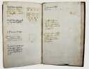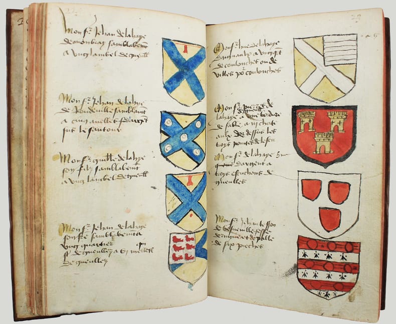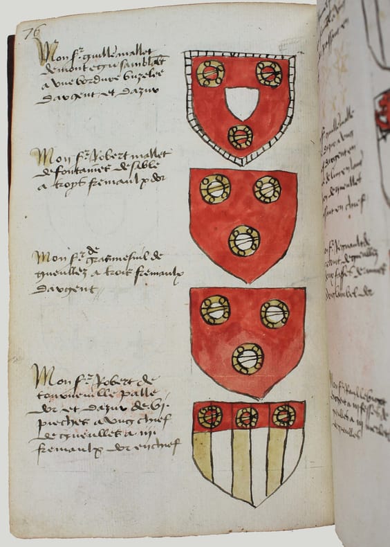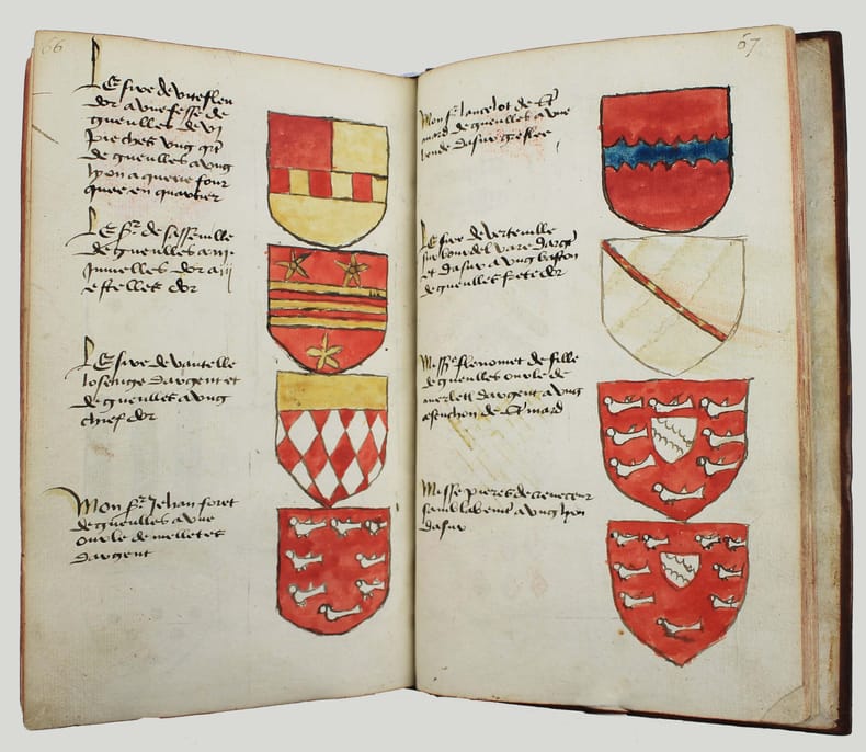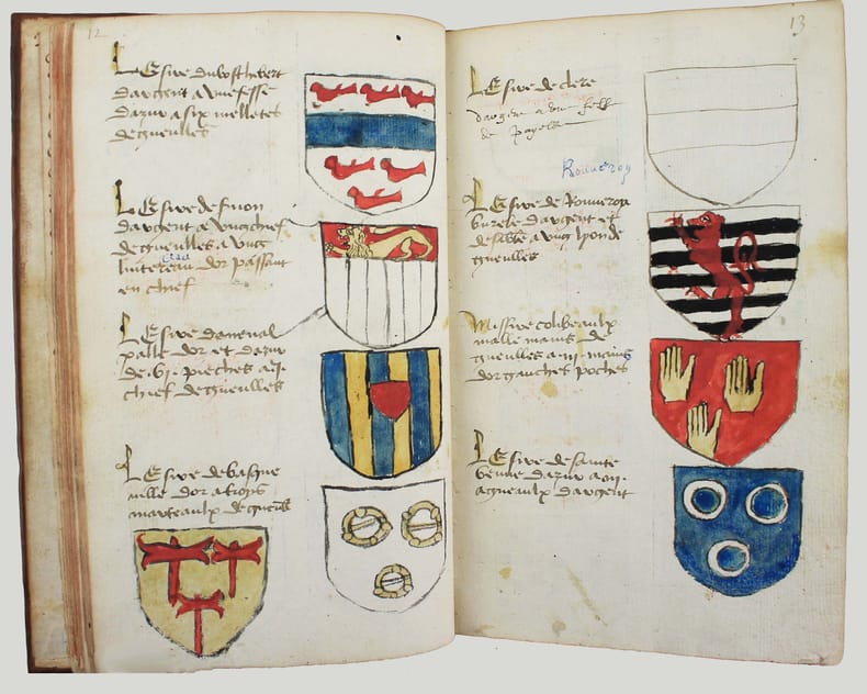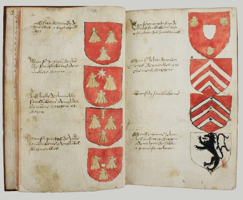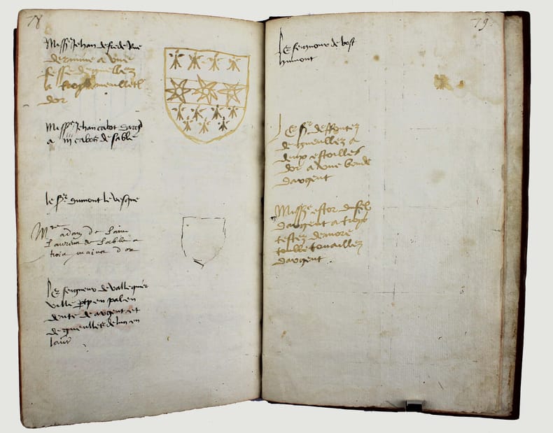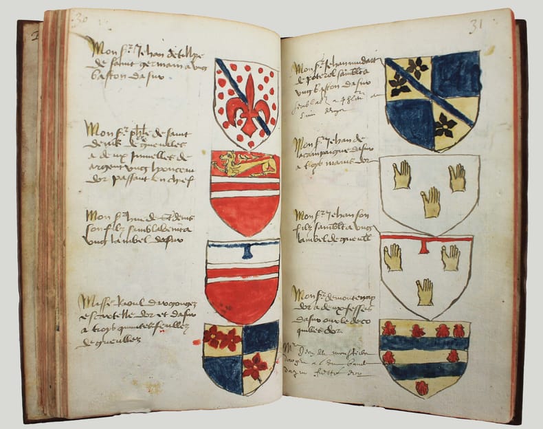 Précieux armorial manuscrit, de la fin du XVe ou du début du XVIe siècle, contenant les descriptions d'environ 300 blasons, dont 265 dessinés à l'encre et aquarellés, et 35 inachevés ou simplement esquissés. environ 230 blasons concernent la Normandie, 65 l' Ile-de-Franceet 5 se rapportent à d'autres provinces. Chaque page est divisée en deux parties: dans la partie gauche se trouve un texte, d'une écriture gothique, contenant les descriptions des blasons, et, dans la partie droite, sont représentés les blasons correspondants. En général, chaque page contient 4 blasons. Ce recueil est en grande partie consacré aux "Bacheliers", c'est-à-dire aux seigneurs qui possédaient des châteaux, forteresses et places qui dépendaient de comtés, vicomtés, baronnies ou châtellenies. Cette appellation apparaît dans le présent manuscrit en page 17. Par rapport à la hiérarchie nobiliaire, le bachelier se situait entre l'écuyer et le chevalier. L'armorial contient, en premier lieu, les blasons d'Ile-de-France(pp. 1 à 10). On recense 40 blasons, parmi lesquels Evrart de Montmorency, Fouques de Marcilly, Louys de Trie, Lohier de Trie (p. 1). - Le sire de Chambly et sa famille (3 blasons), Pierre de Villers (p. 2). - Tristan de Villers, Jehan de Garencières et son fils (2 blasons), Jehan Lestandart (p. 3). - Regnault d'Orgesuy et un parent (2 blasons, dont un esquissé), Jehan de Mesgnou, Hervieu Le Cornu (p. 5). - Richard de Court, Hervier de Villers, Arnoult de Villers, le sire de Mitry (p. 6). - Guy Le Boutiller, Pierre et Philippe de Hangeville [Angervilliers], Guillaume du Chastelier (p. 8). - Guillaume Mauvoisin, Hagueny de Bouville (p. 9). - Hagueny de Bouville, Philippe de Guyencourt (non dessiné), Jehan Le Veneur (p. 10). A la suite se trouve la partie la plus importante, consacrée aux blasons de Normandie(pp. 10 à 59). On compte environ 190 blasons, parmi lesquels: Le sire de Moullay [Molay] (p. 10). - Les sires de Boishebert, de Sernon, d'Arneval [Esneval] et de Basqueville (p. 12). - Les sires de Tournebu, de Marbeuf, de Torigny et de Beuzeville (p. 16). - Monsr. Fouques Peinel [Paynel] et trois parents (pp. 17-18). - Monsr. Guillaume de Briqueville et Guillaume de La Haye (p. 21). - Monsr. Jehan de La Haye et cinq parents (pp. 22-23). - Henri de Trousseauville et un parent; Thomas de La Luzerne (p. 26). - Monsr. de Tilly de Grenetot et trois parents (pp. 29-30). - Monsr. Pierre d'Argences, Jehan du Bois, Guillaume de Perchie [Percy], Monsr. de Meautis (p. 33). - Monsr. de Caligny, de Longy, Richard de Chaumont, Guillaume Pouchin (p. 36). - Monsr. Jehan Martel, d'Yvetot, de Bonnebosc (p. 40). - Monsr. Robert de La Plainque, Richard d'Oille [Ouilly], Pierre de Survie (43). - Monsr. de Fontenay du Mesnil Toufray, d'Urville, de Vaulx, Philippe de Harenville [Harenvilliers] (p. 47). - Baudrain de La Heuse, Guillaume de Villers du Hommet et cinq parents (pp. 53-54). - Le sire d'Estouteville (p. 55). - Monsr. Regnault de Braquemont (p. 56). - Les sires de Blaru et de Morfaville (p. 58). - Monsr. Guillaume de Brucourt, Guillaume de Manneville [Magneville] (p. 59). Viennent ensuite deux blasons d'Artois: Monsr. Eustache et Jehan de Saint-Cler (p. 59). Les pages 60 à 79 contiennent d'autres blasons d'Ile-de-France (environ 25) et de Normandie (environ 40). Pour l'Ile-de-France, on relève: Le sire de Chennevières, Monsr. Thibault de Fleury, le sire de Neuville (p. 60). - Monsr. Adam Le Brun, Jehan de Plainvillier, Jehan d'Andrezel (p. 61). - Mess. Jehan des Essarts, Monsr. Perceval de Garennes (p. 64). - Monsr. Lancelot de Saint-Marc, Mess. Pierre de Crèvecoeur (p. 67). - Mess. Jehan de Saint-Louys, Monsr. Jehan Le Fauconnier (p. 68), etc., et pour la Normandie: Monsr. Louys de Marigny, Martin et Pépin des Essarts (p. 63). - Monsr. Gauvain de Vauville, Guillaume de Grouchie, Thomas d'Oureville, Philippe d'Isigny (p. 69). - Monsr. Robert de Fontenay et un parent, Regnault de Carteret, Richard de Sansay [Sancy], Mahieu du Fougeroy (p. 71). - Monsr. Guillaume de Bailleul, Sauvage de Pommereul, Guillaume du Bosc, Jehan de Neufville (p. 73). - Regnault de Harecourt [Harcourt] (p. 77), etc. On y trouve aussi un blason de Vermandois(Héron du Mail), un d'Anjou (Yvon Cholet) et un de Picardie (Jehan Forest). Un grand nombre de blasons se retrouvent dans l'armorial du héraut Navarre, un manuscrit composé vers 1368-1375 et qui contient les descriptions de plus de 1500 blasons. D'après Saffroy, son auteur serait Martin Carbonnel, héraut de Charles le Mauvais, roi de Navarre. Si l'original est aujourd'hui perdu, la BnF en conserve 21 copies manuscrites, datant pour la plupart du XVe siècle. L'une d'entre elles porte comme titre: "Blazon et deviz des armes de tous les Roys chrétiens Princes et seigneurs du sang de France et autres barons, baneroys et chevaliers du Pays de France, Normandie, Champaigne, Bourgongne, Bretaigne, le Maine, Anjou, Tourayne, Vermandoys, Beauvoisin, Pontif, Artois, Corbyois, Poitou, Berry, Breban, Flandres, Henault et Angleterre" (ms fr. 14356, XVe siècle, sur papier, 130 pp.). Son contenu a été analysé par Steen Clemmensen, qui a retranscrit tous les "items", ou articles, en y ajoutant une retranscription moderne de chaque nom de famille avec l'indication des provinces auxquelles ils se rattachent. Le présent manuscrit pourrait être un extrait de l'armorial du héraut Navarre, mais l'orthographe des noms est souvent différente et l'ordre des notices ne correspond pas (ou rarement) à cet armorial. Le filigrane du papier est coupé par le fond de la reliure, mais on peut y voir trois fleurs de lys surmontées d'une couronne recouverte d'une croix. Ce motif se rapproche de deux modèles reproduits dans Briquet, Les Filigranes, n° 1746 (utilisé entre 1506 et 1526) et n° 1749 (entre 1487 et 1496). Le papier peut ainsi être daté de la fin du XVe ou du début du XVIe siècle. Une table alphabétique, intitulée "Table du M.S." (manuscrit)se tro